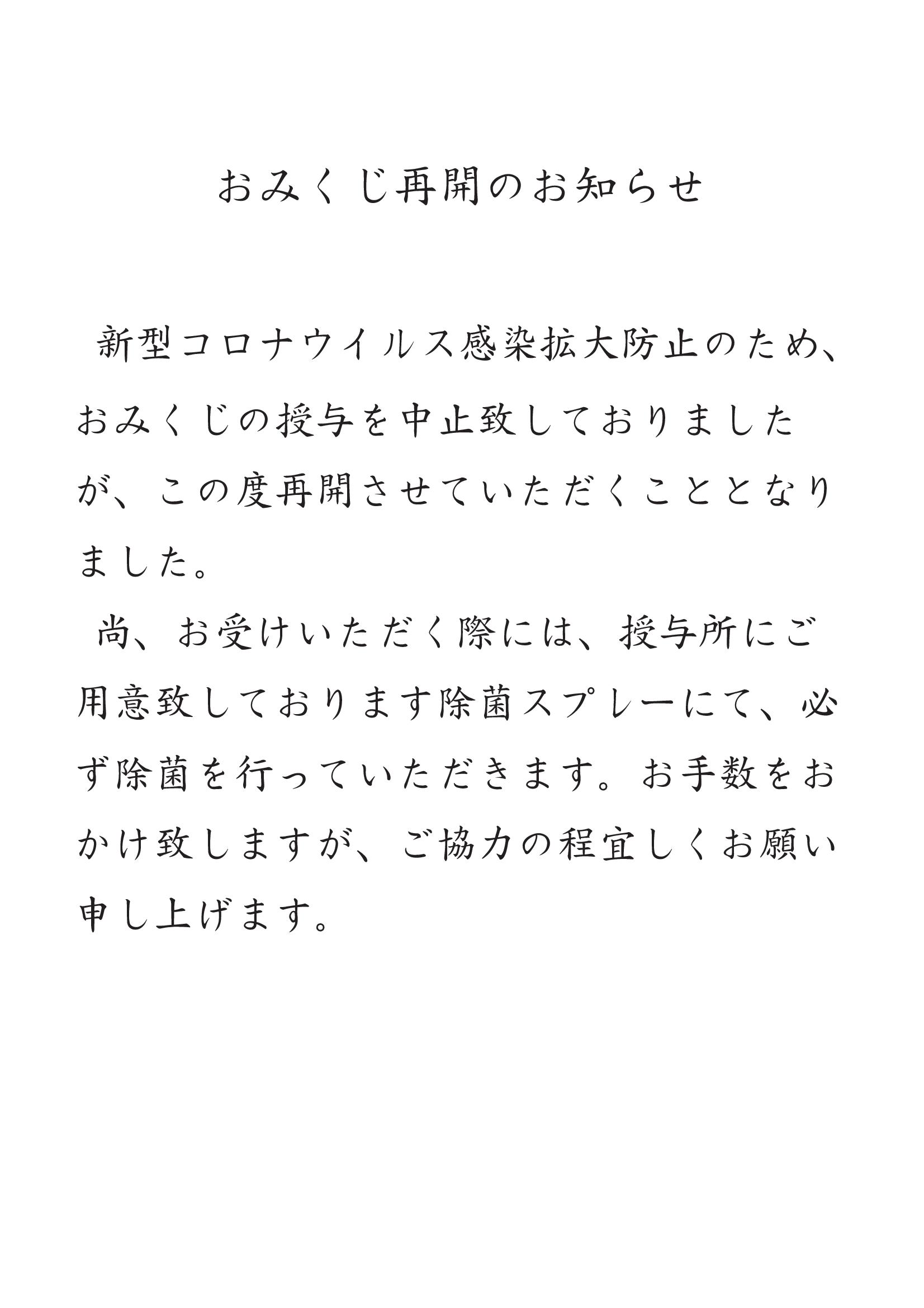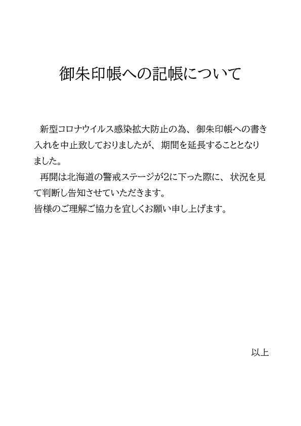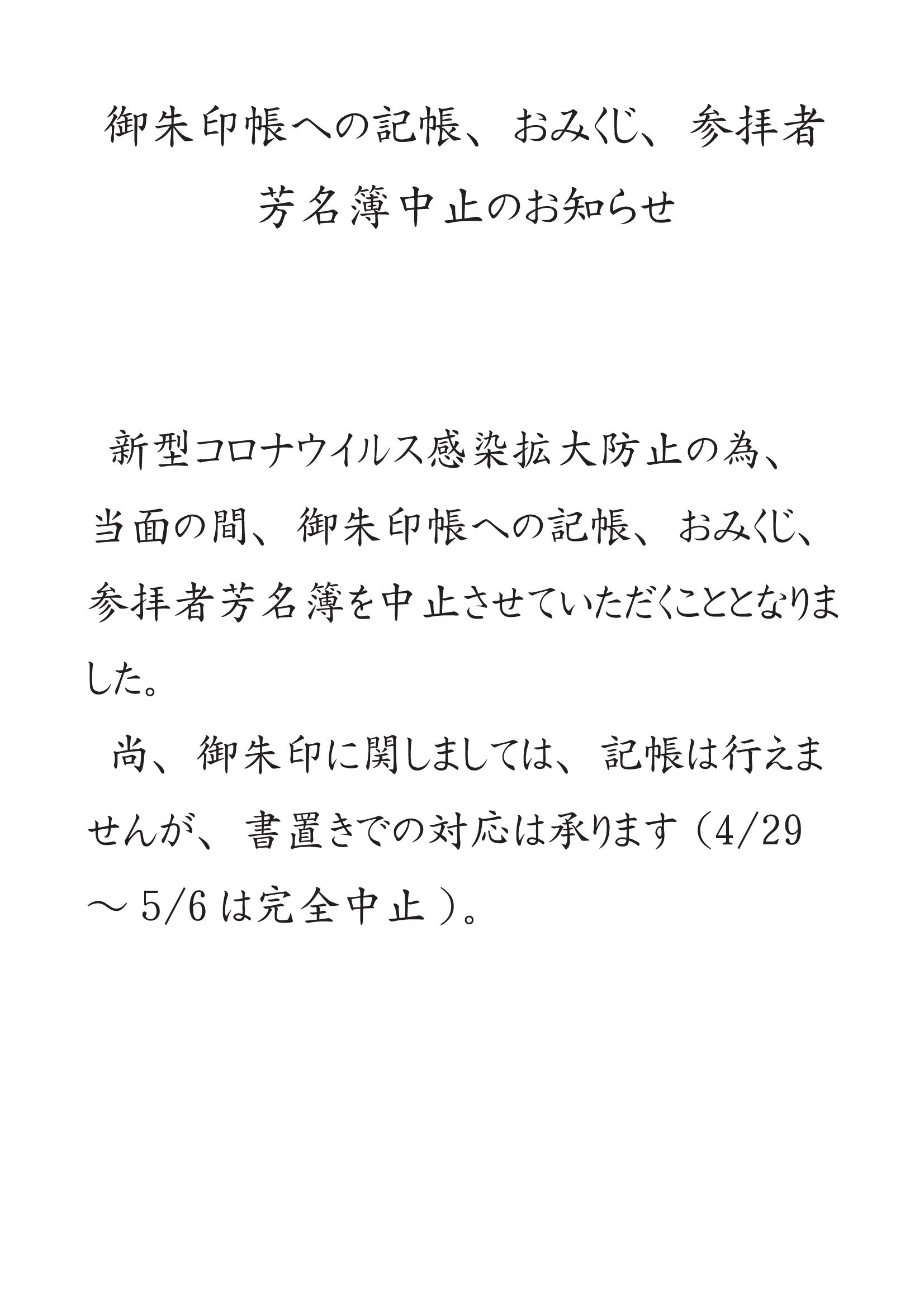 - 御朱印帳への記帳、おみくじ、参拝者芳名簿中止のお知らせ