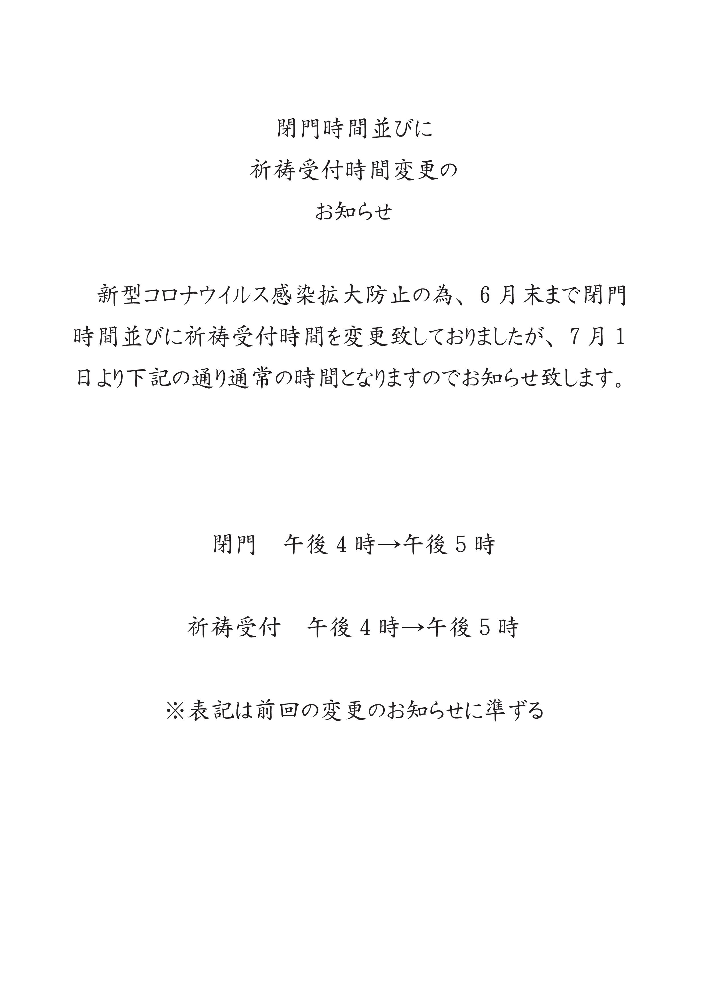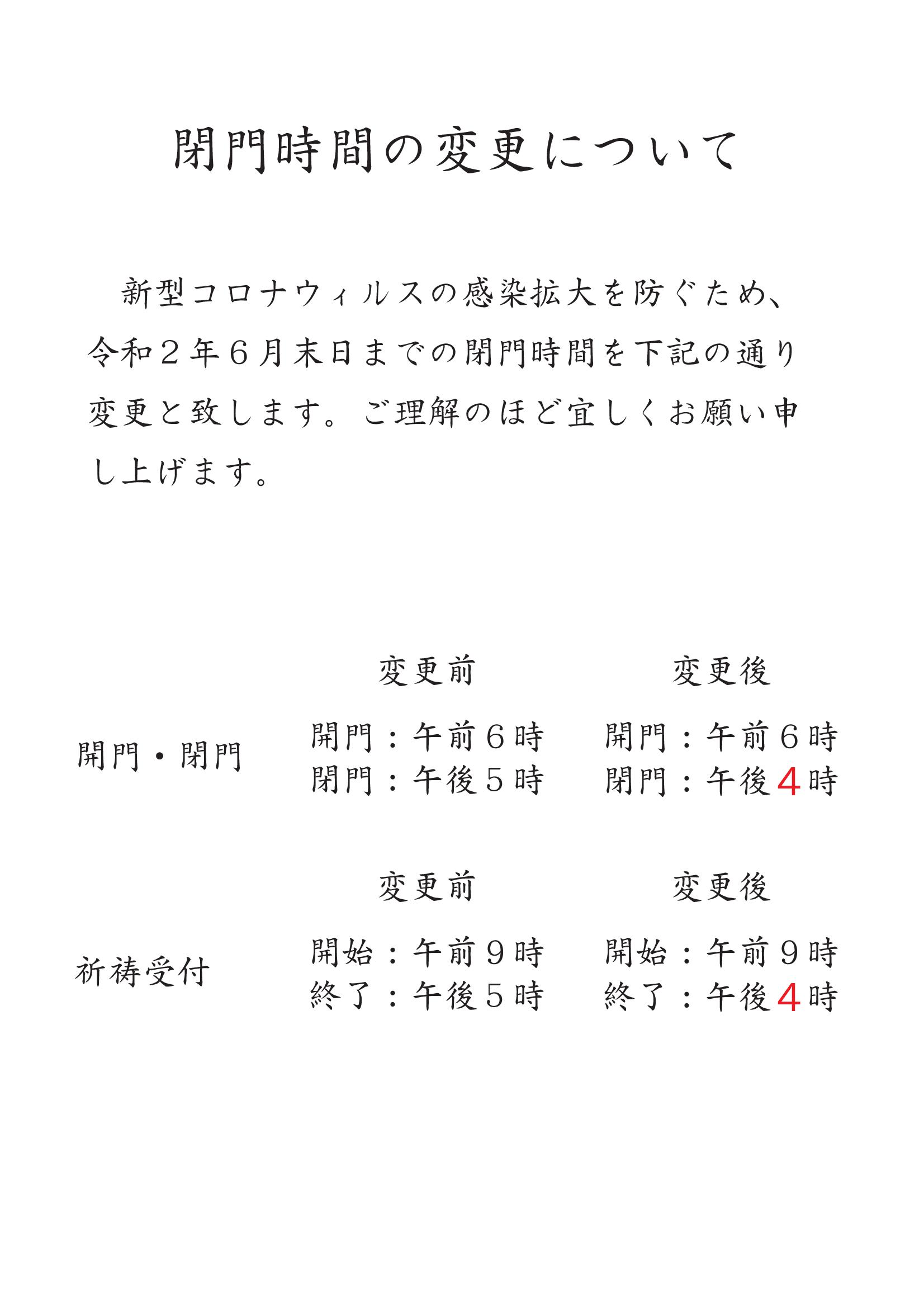 - 令和2年6月26日閉門時間並びに祈祷受付時間変更のお知らせ