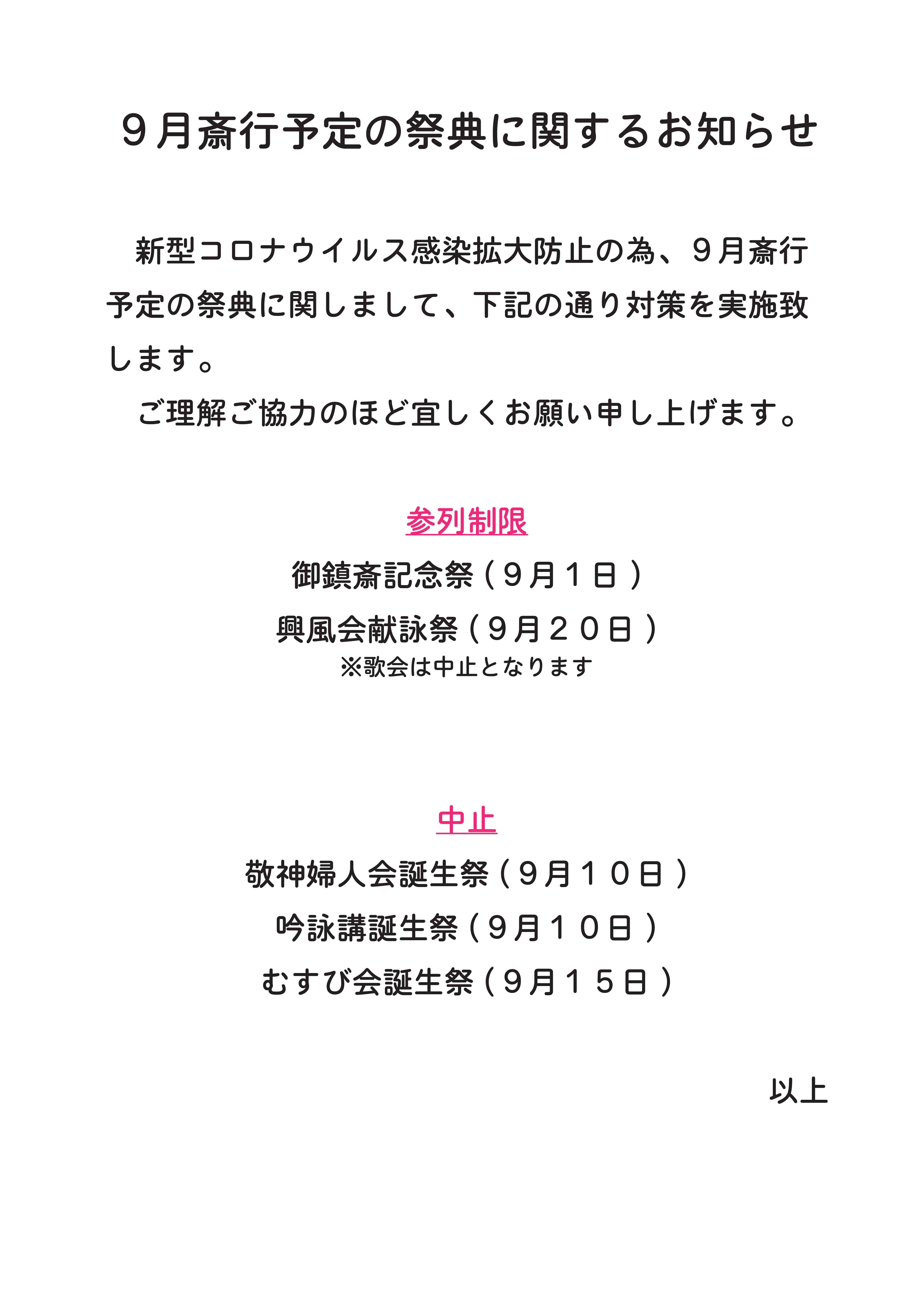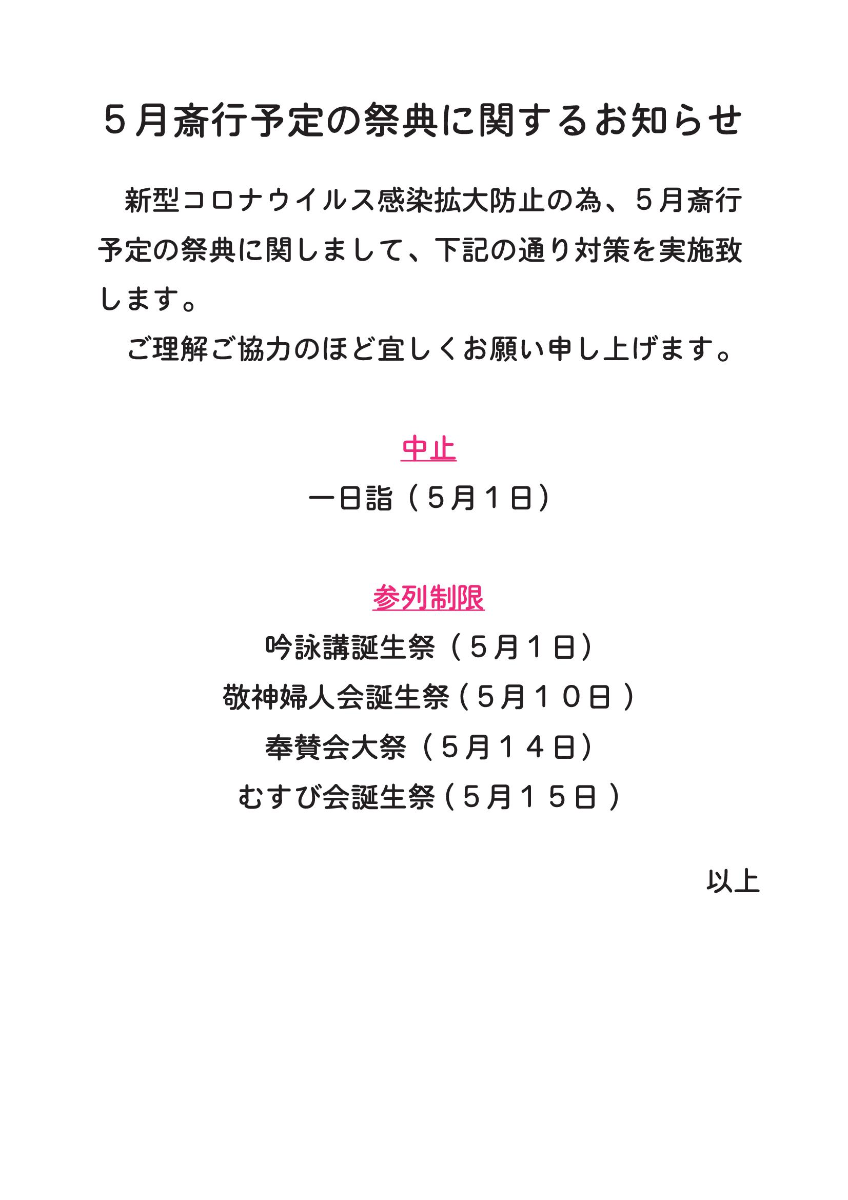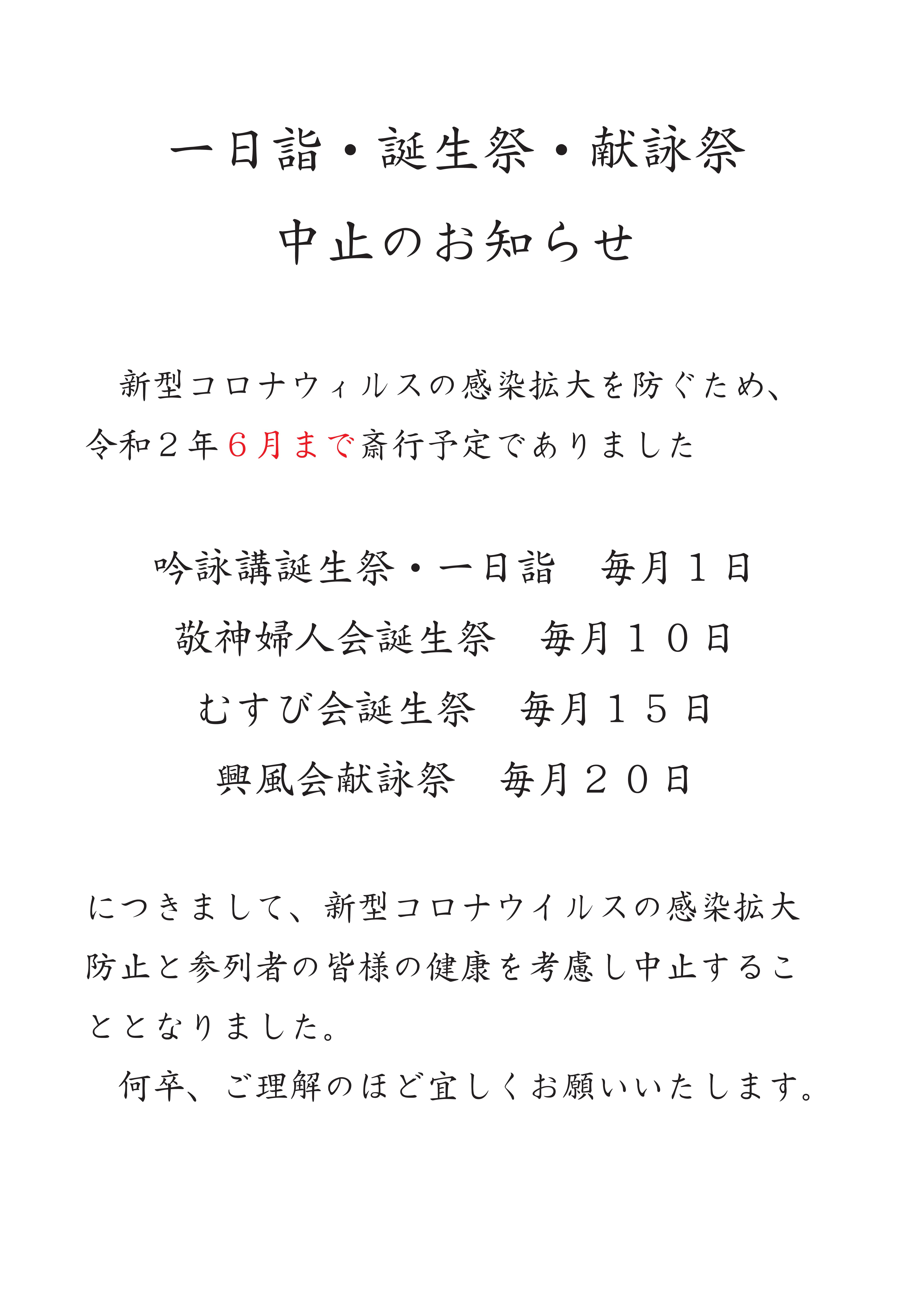 - 一日詣・誕生祭・献詠祭中止のお知らせ