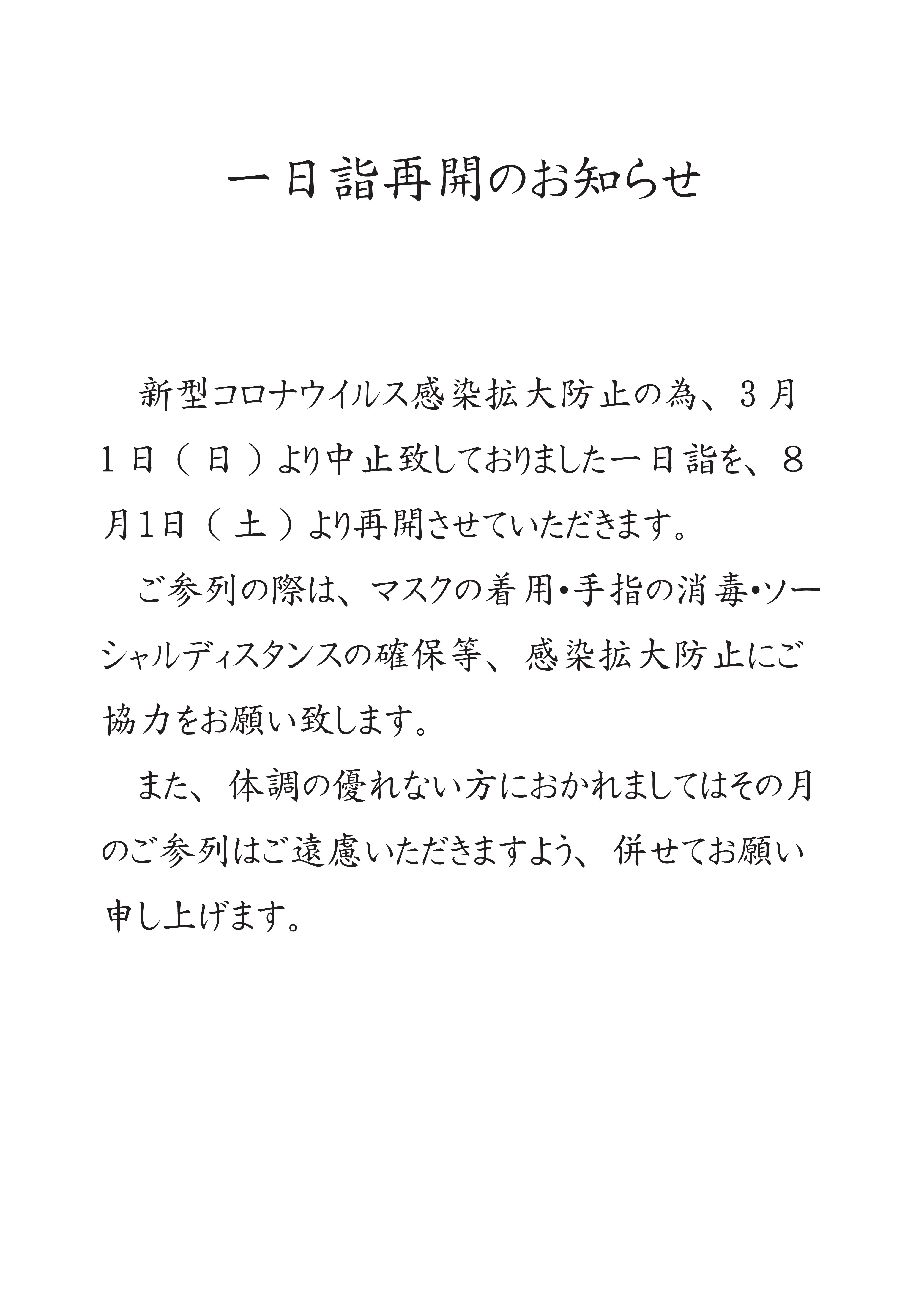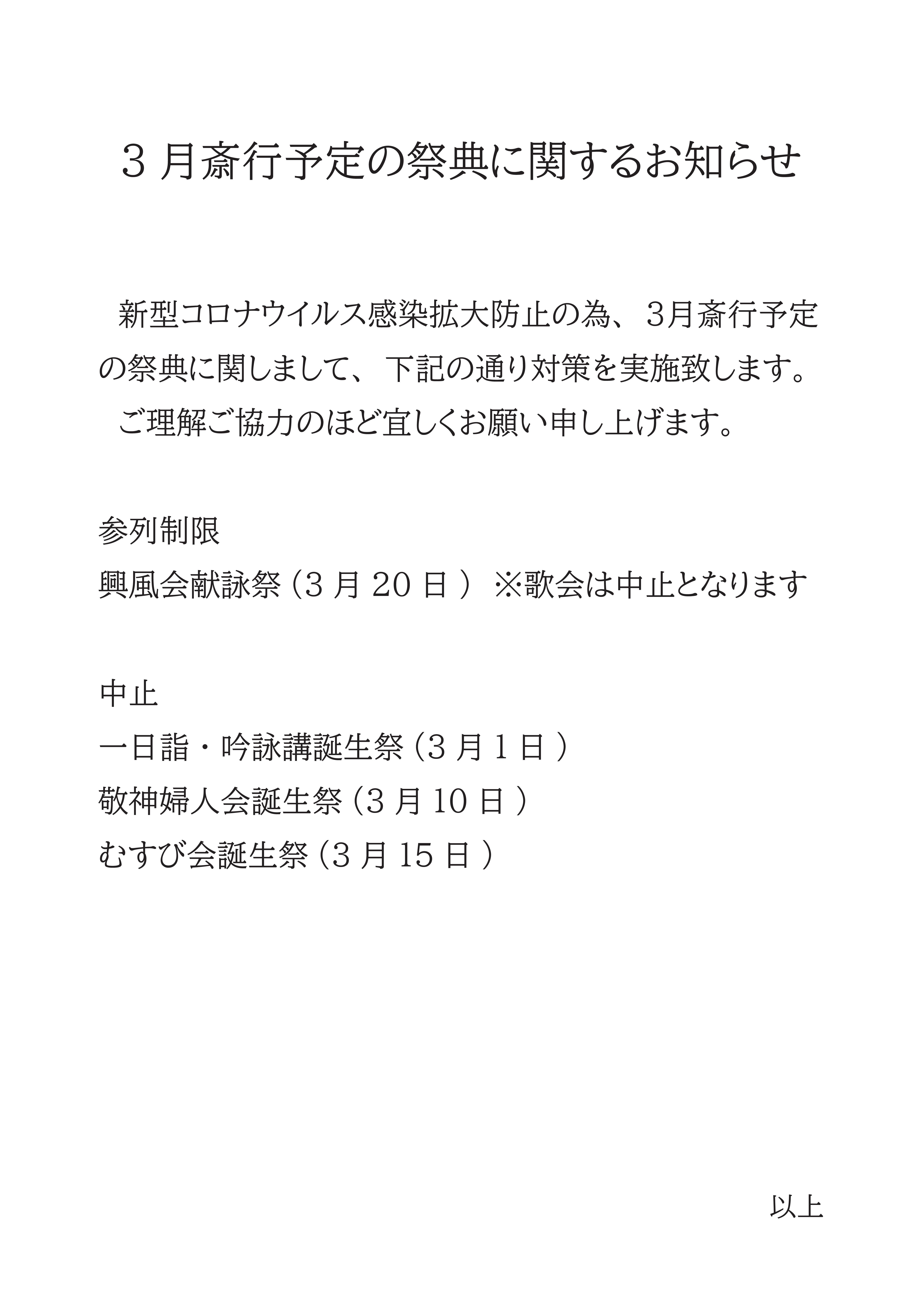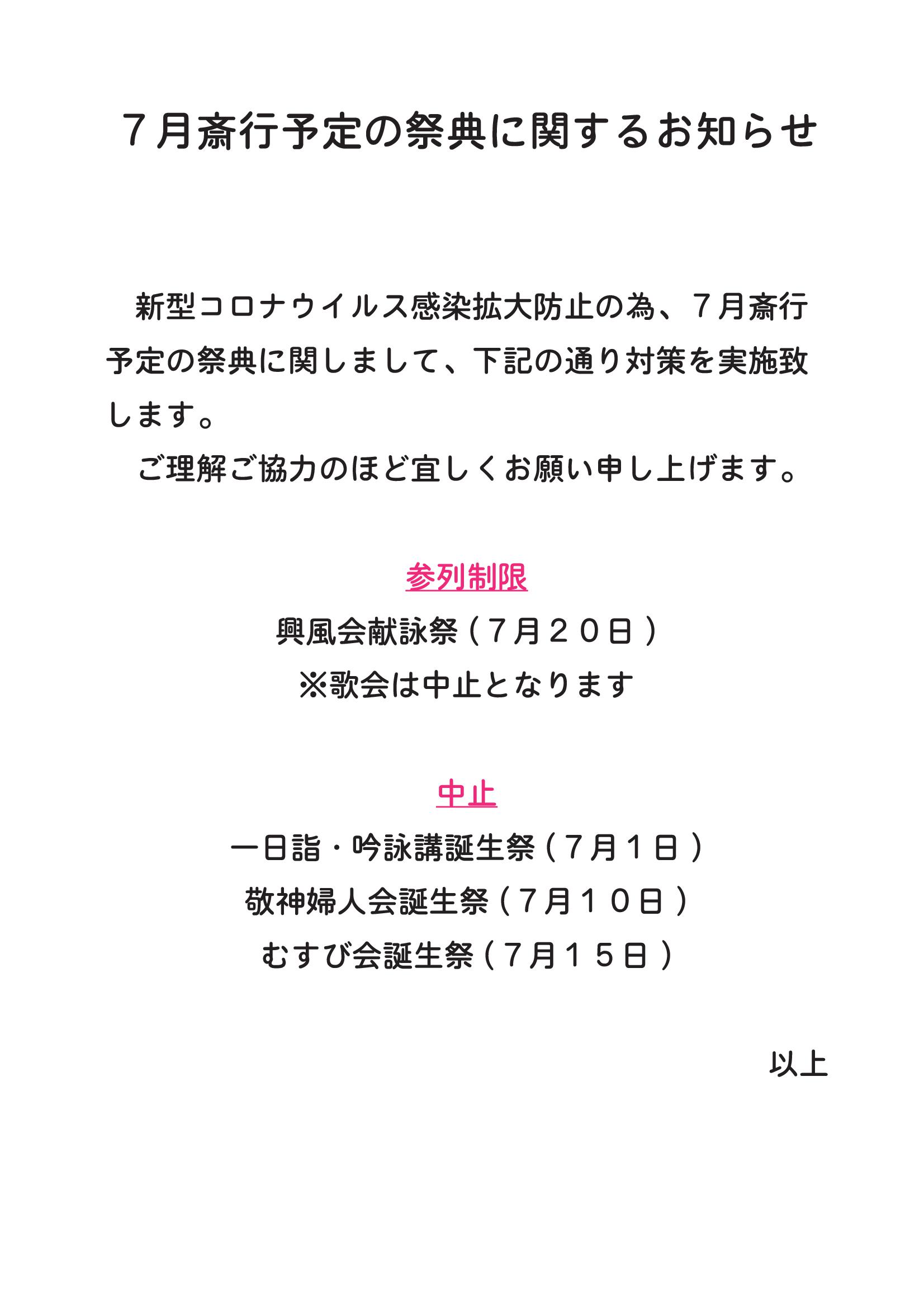 - 一日詣・誕生祭・献詠祭中止のお知らせ
