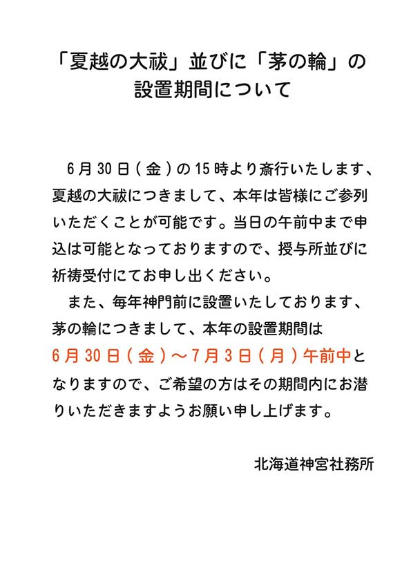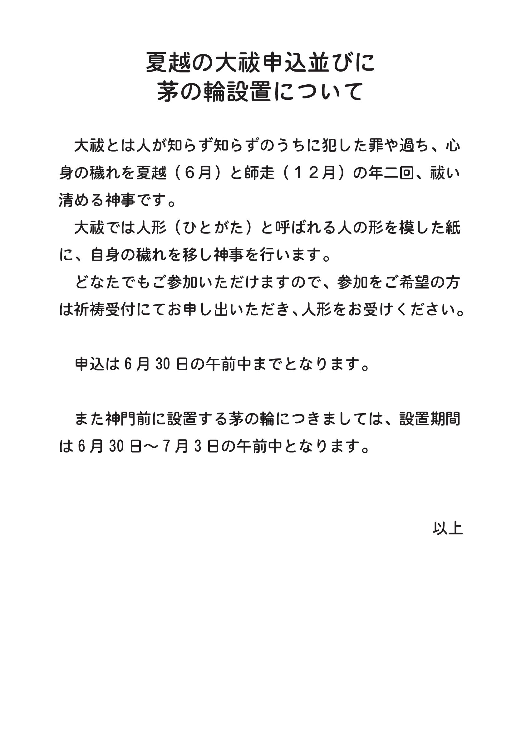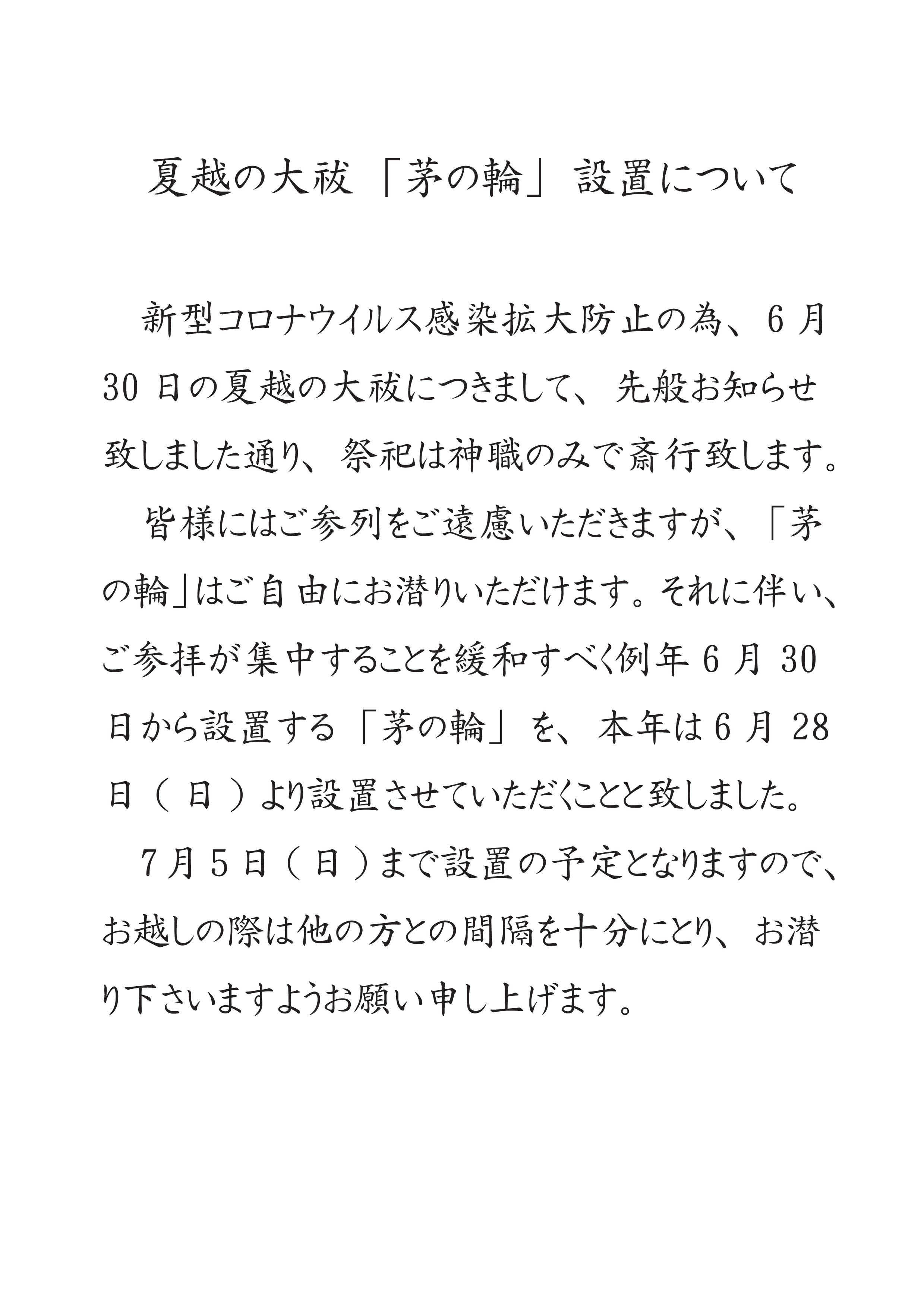 - 令和5年6月21日「夏越の大祓」並びに「茅の輪」の設置期間について