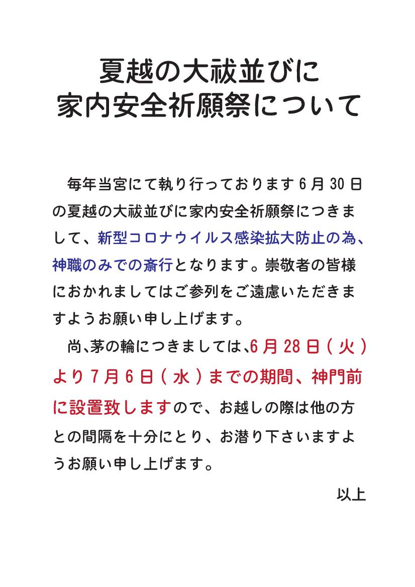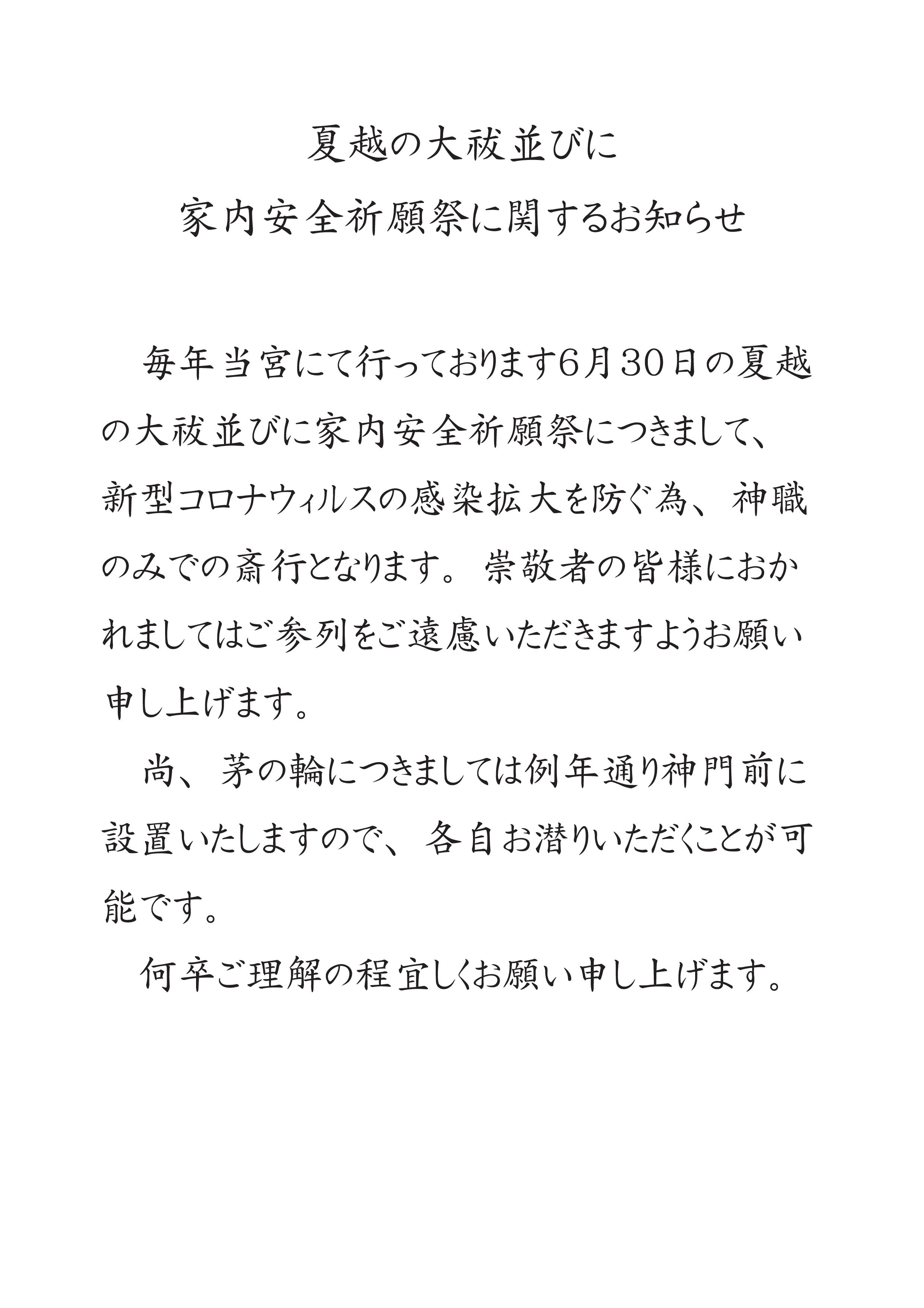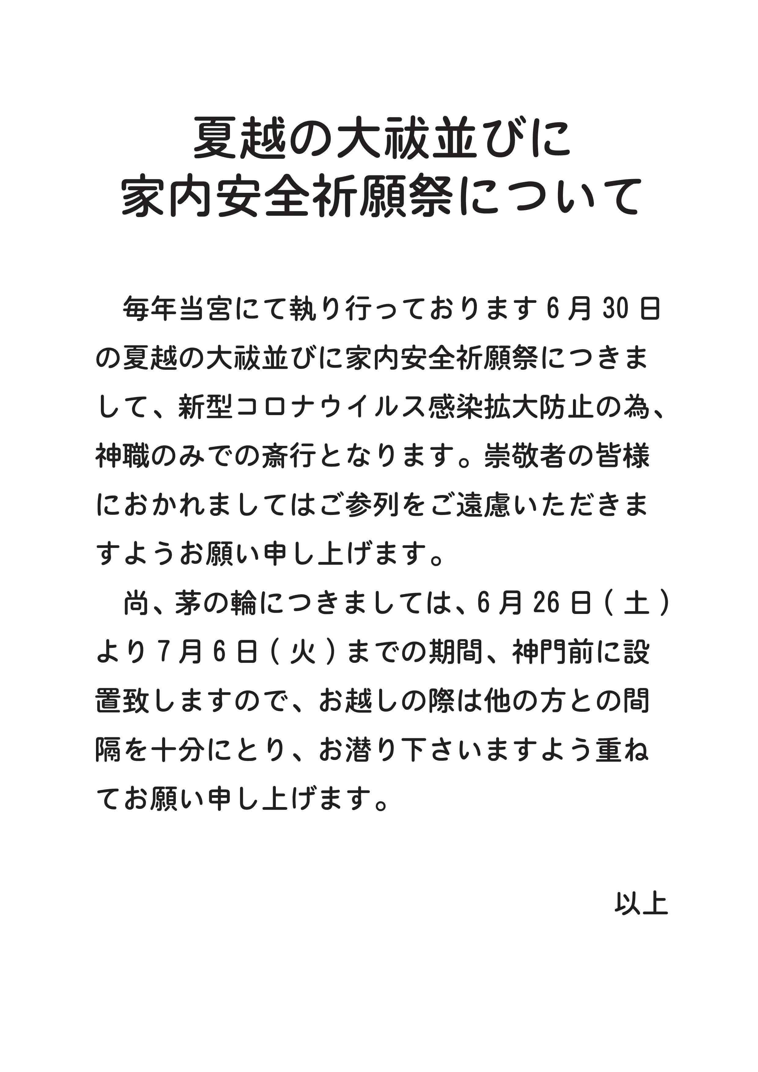- 令和2年6月10日夏越の大祓並びに家内安全祈願祭に関するお知らせ