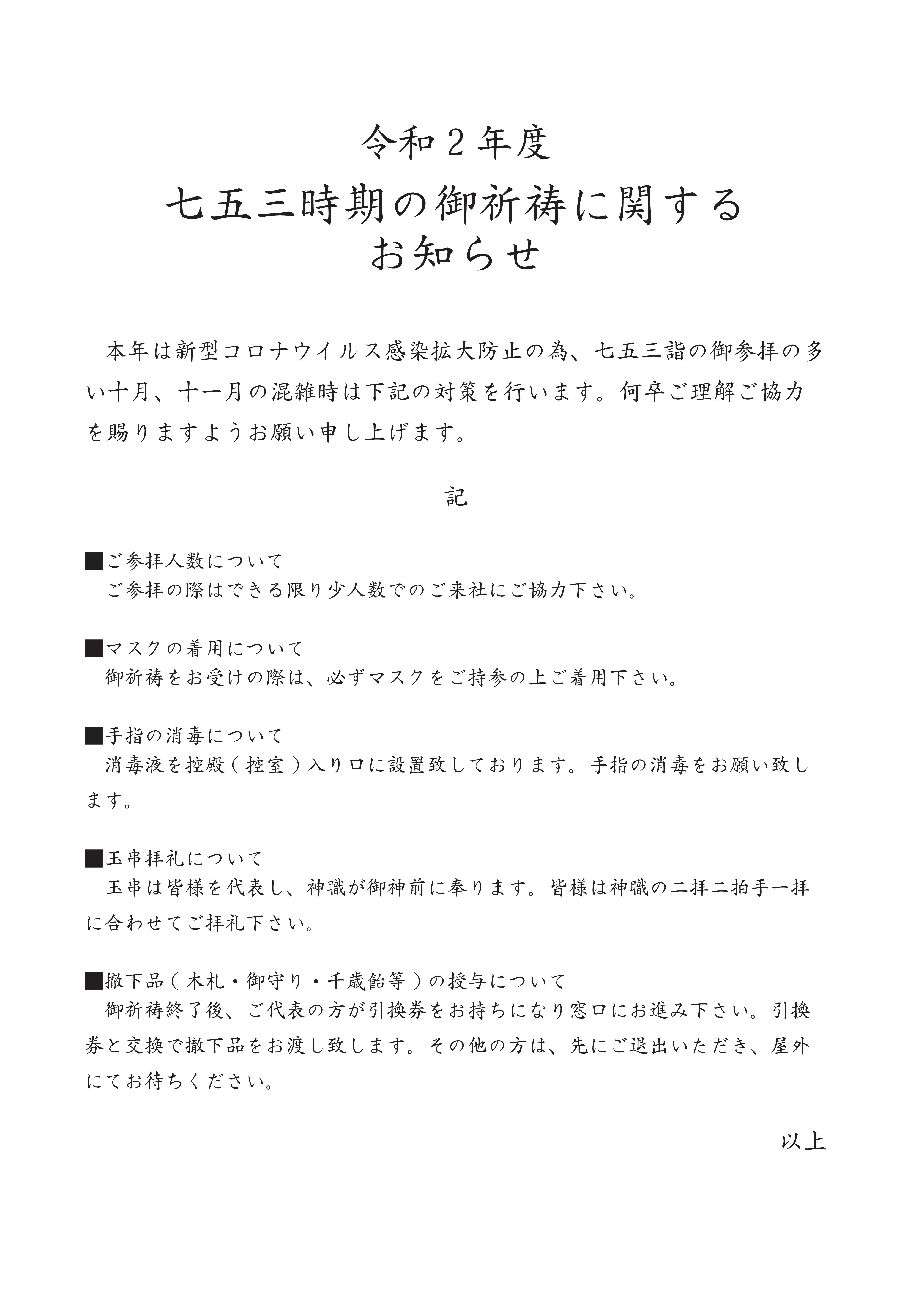 - 令和2年10月2日七五三時期のご祈祷に関するお知らせ