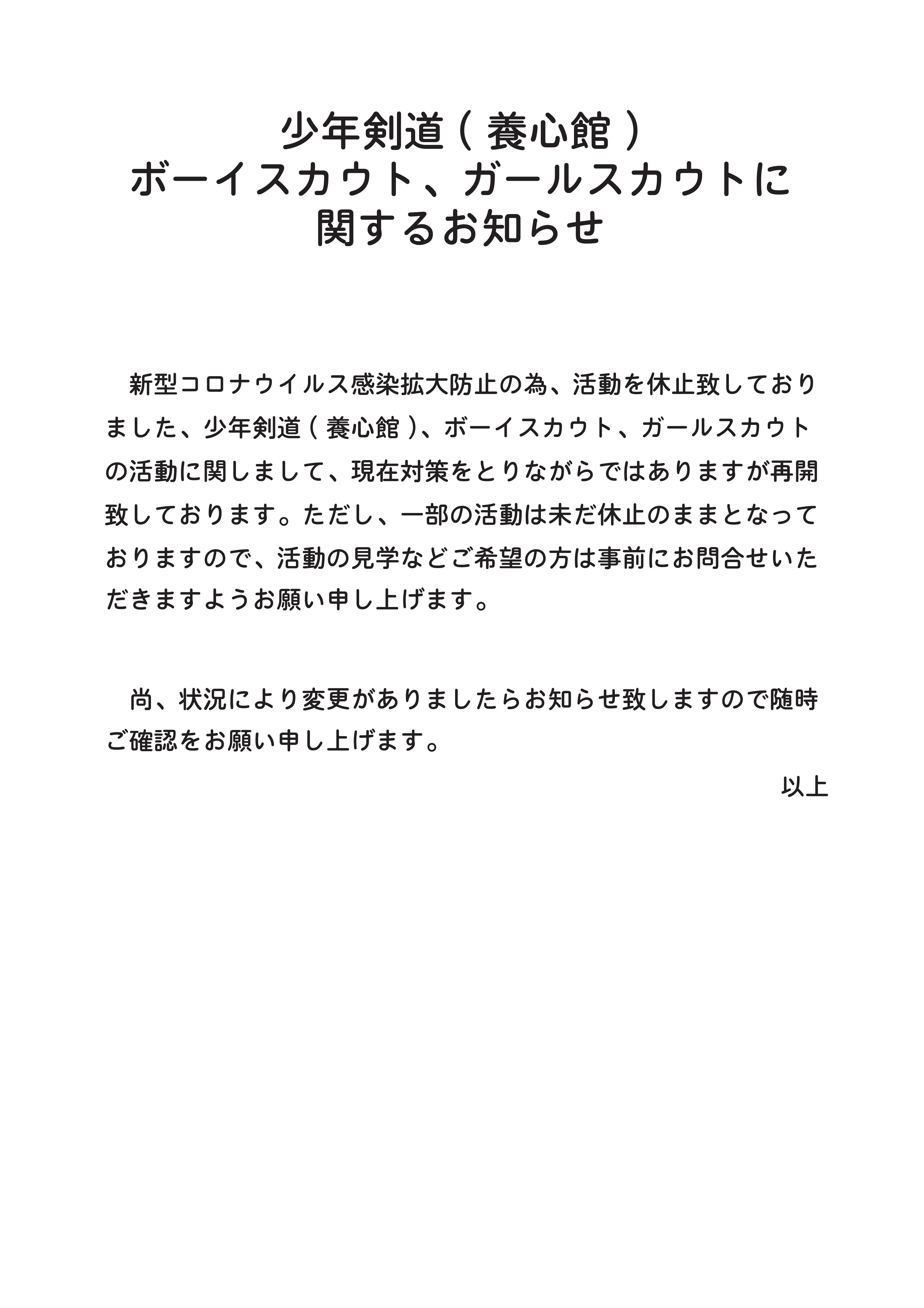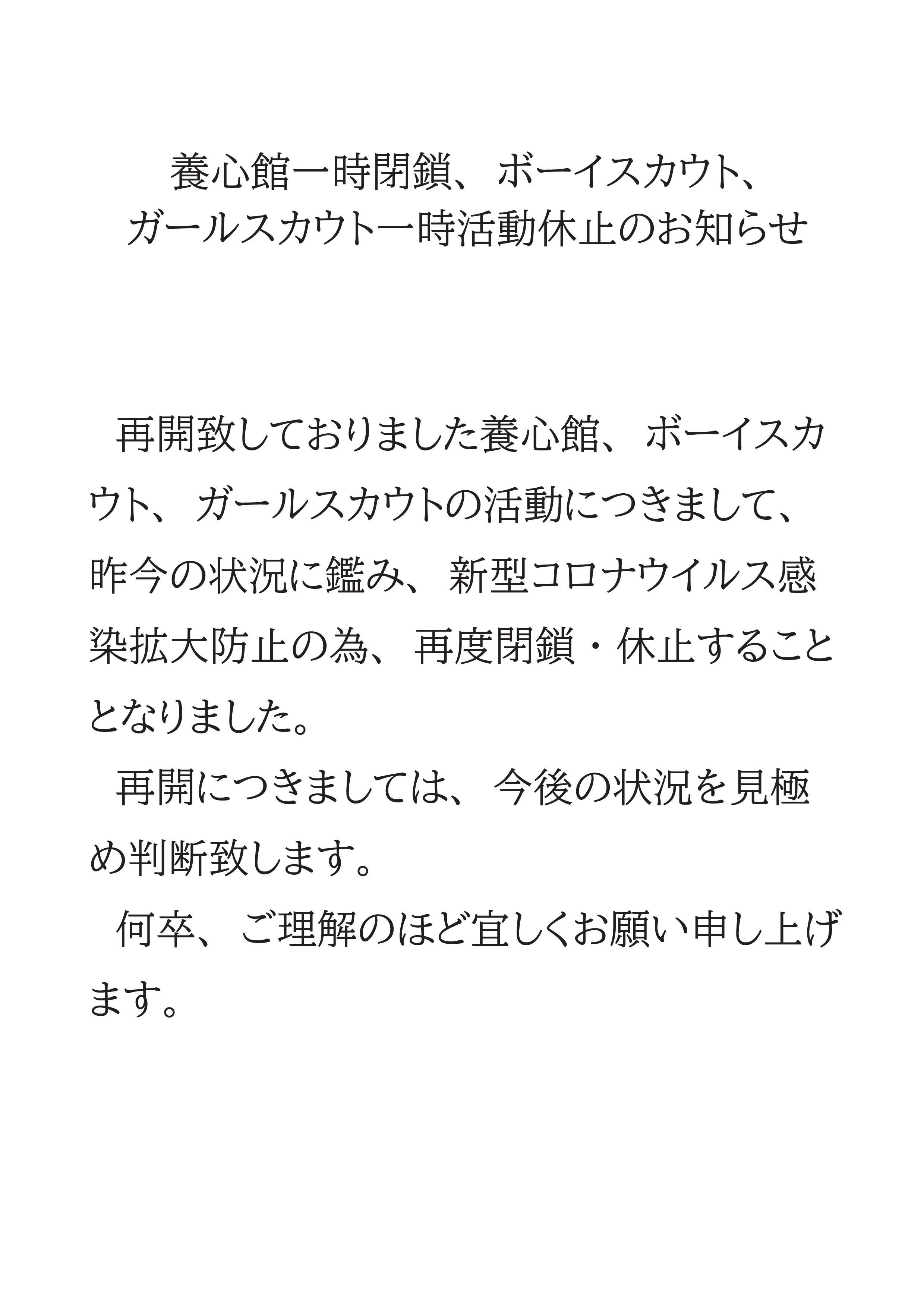 - 令和2年11月10日養心館一時閉鎖並びにボーイスカウト、ガールスカウト一時活動休止のお知らせ