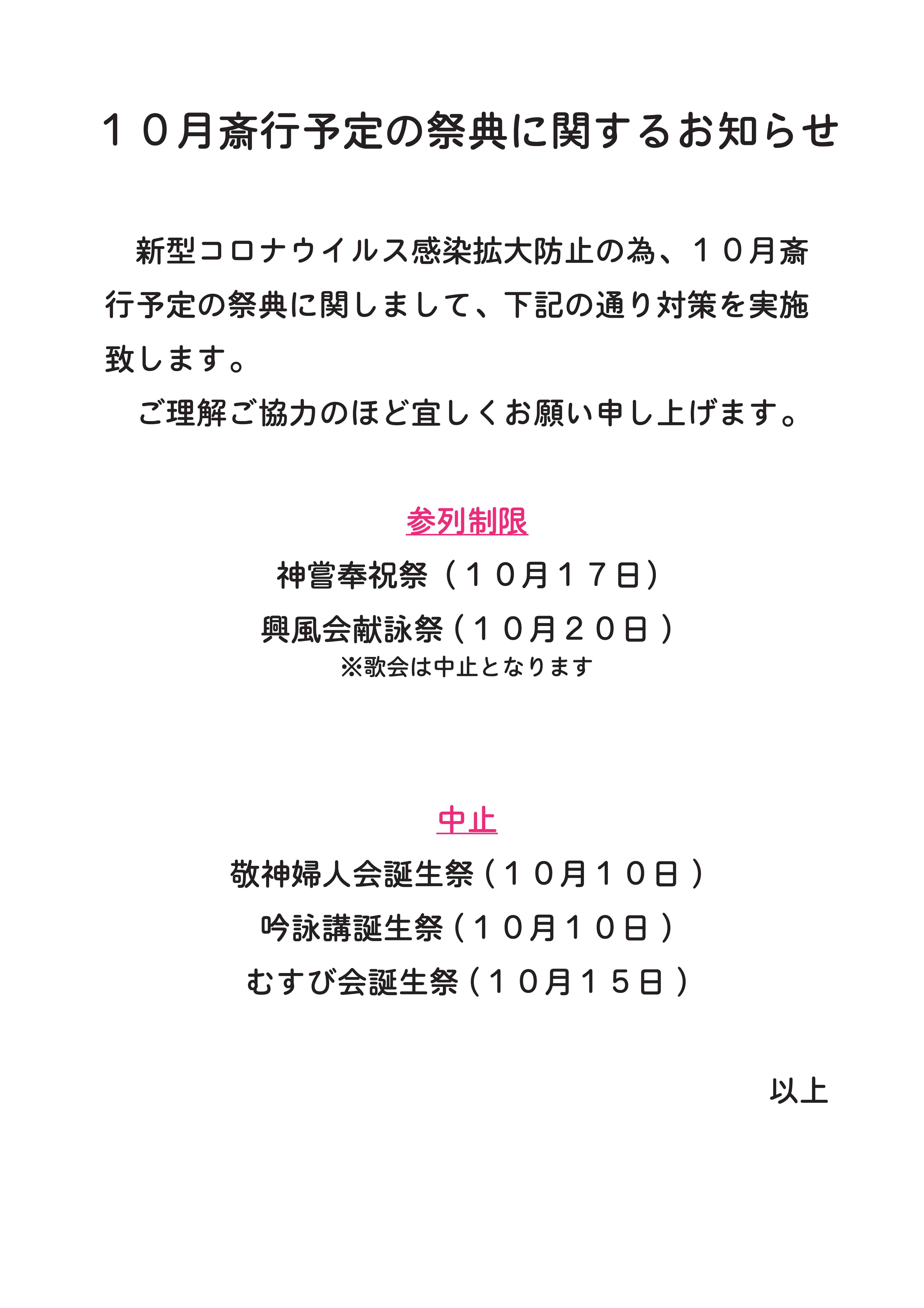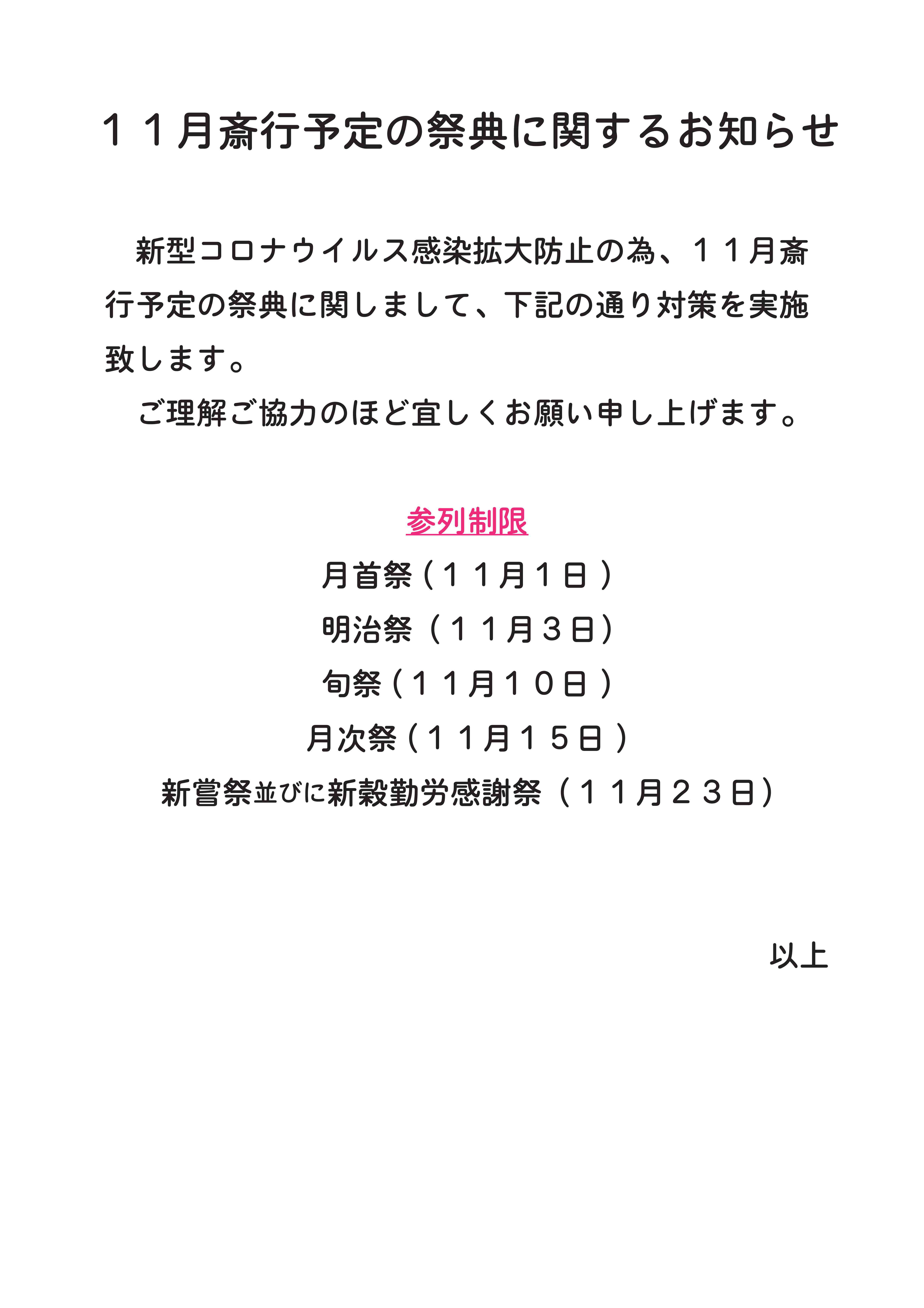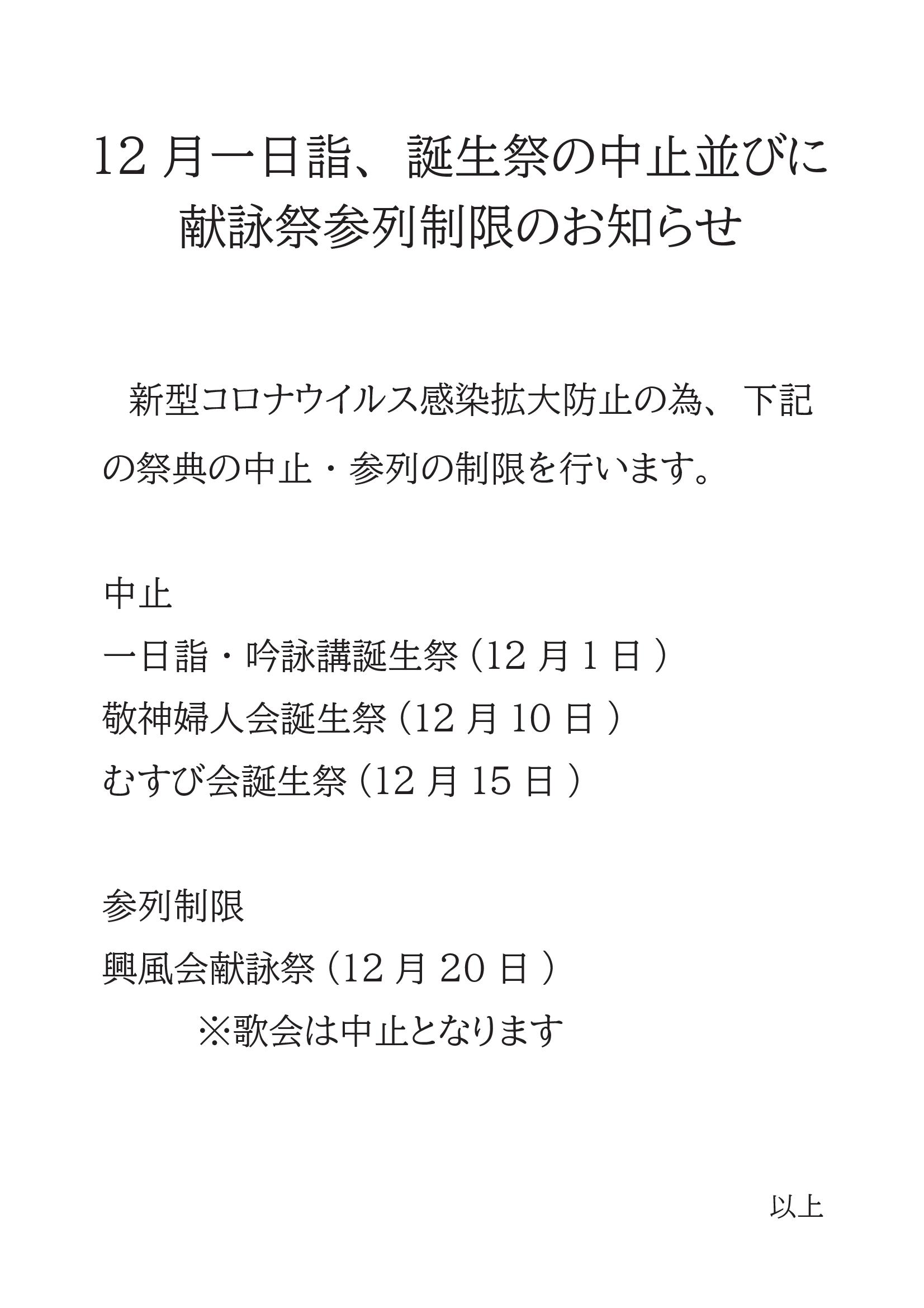 - 令和2年11月24日12月一日詣、誕生祭の中止並びに献詠祭参列制限のお知らせ