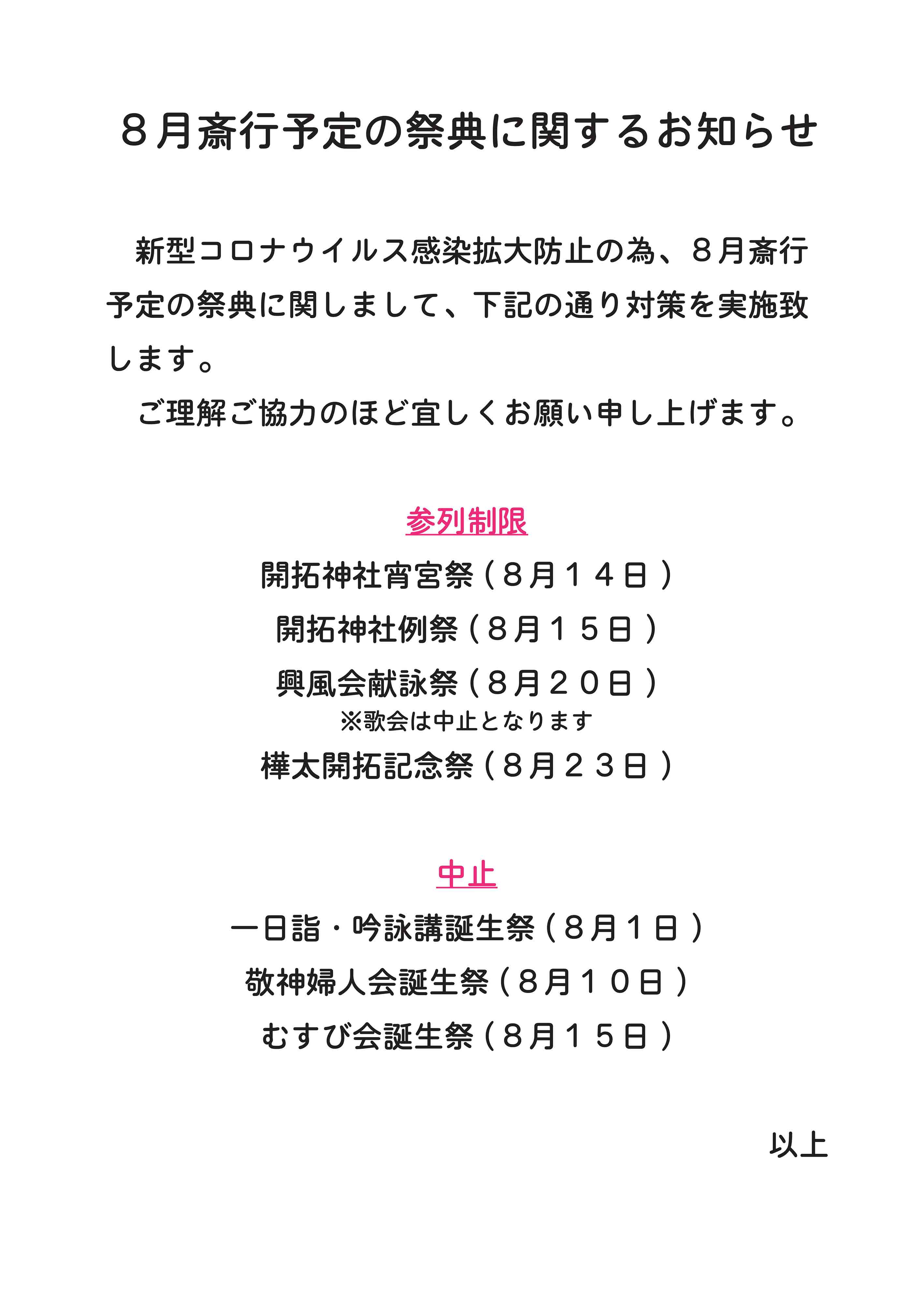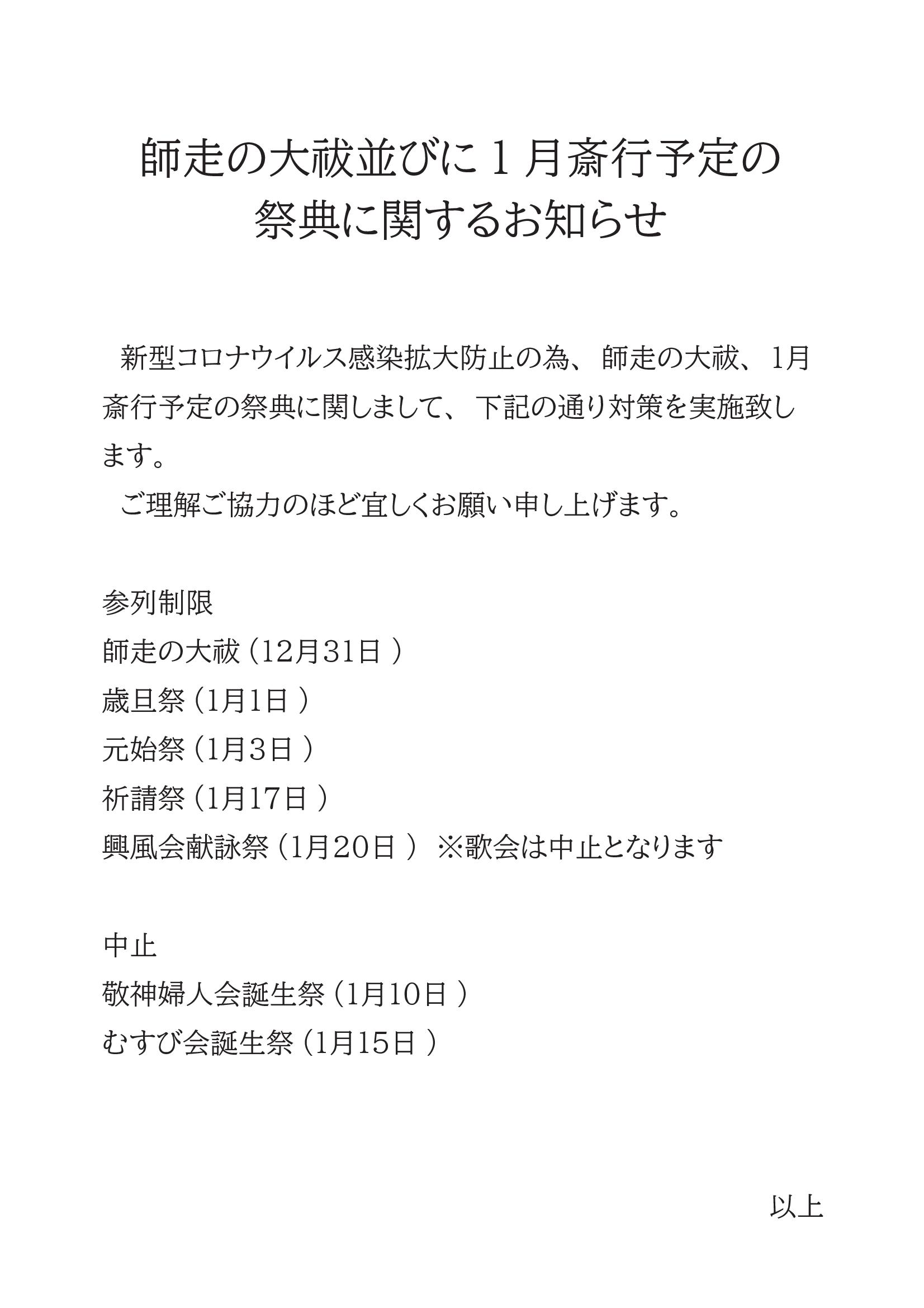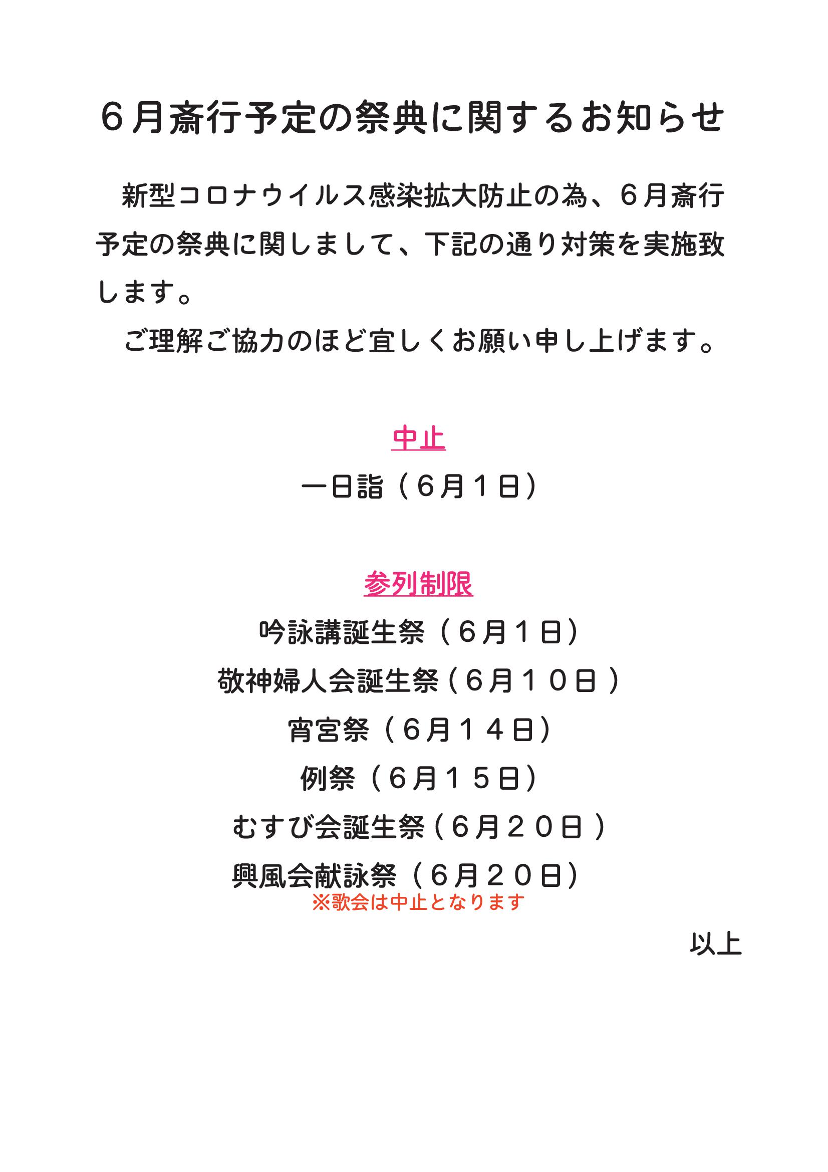 - 令和2年11月24日12月一日詣、誕生祭の中止並びに献詠祭参列制限のお知らせ