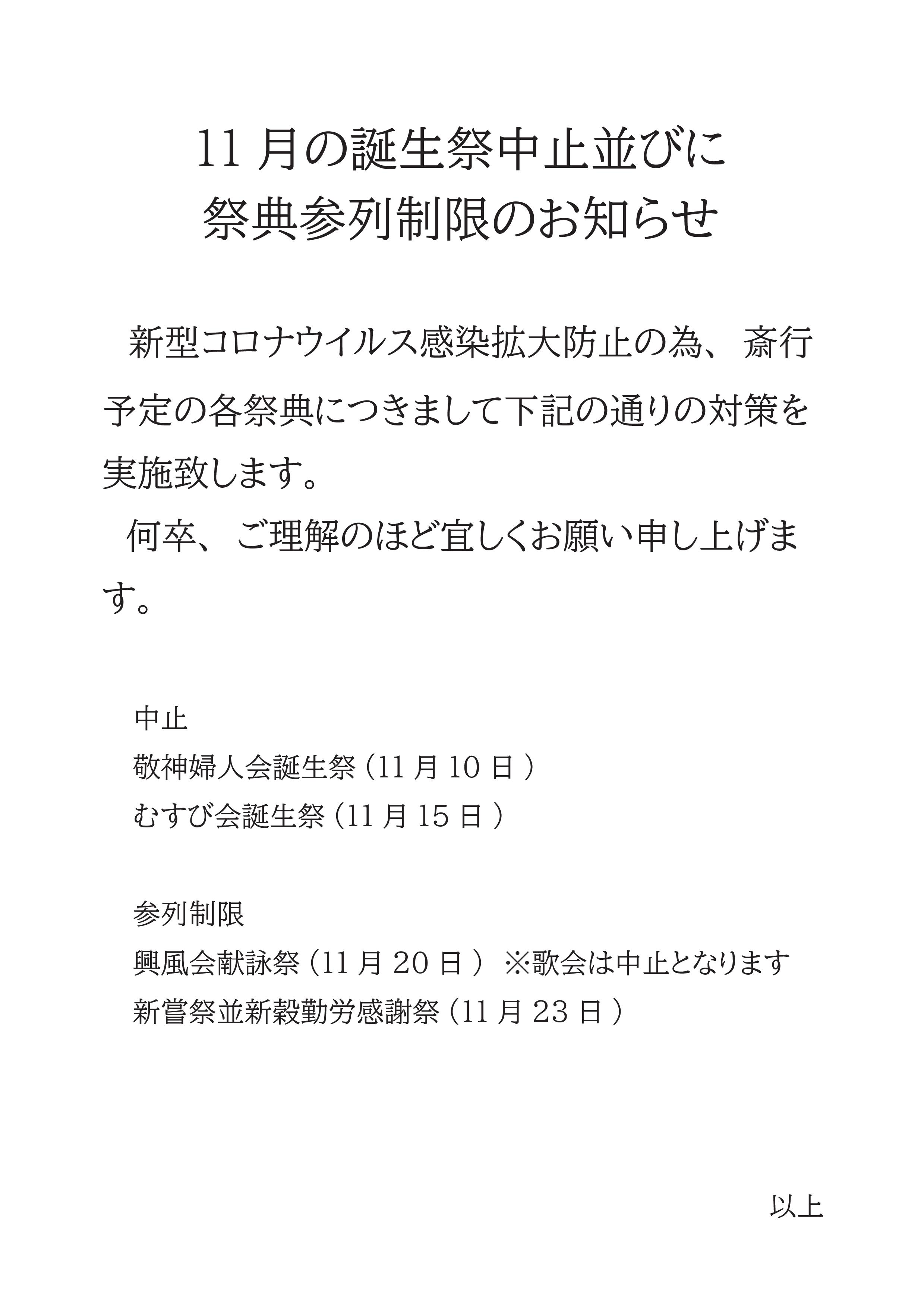 - 令和2年11月10日11月誕生祭中止並びに祭典参列制限のお知らせ