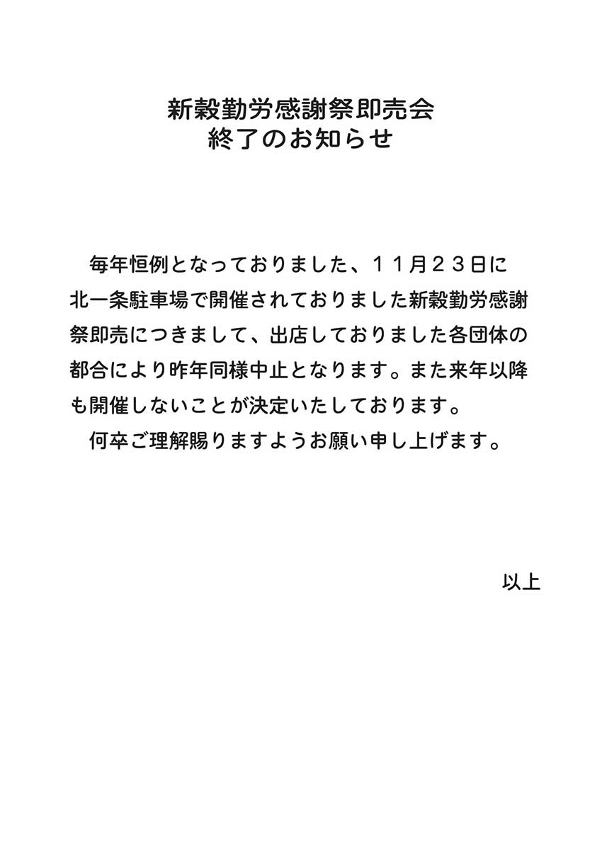 - 令和6年11月18日新穀勤労感謝祭『即売会』終了のお知らせ