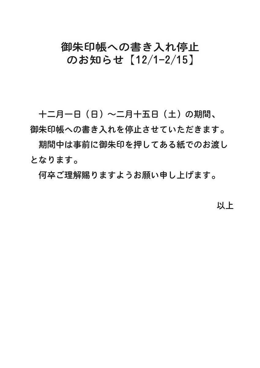 - 令和6年11月18日御朱印帳への書き入れ停止のお知らせ【12/1-2/15】