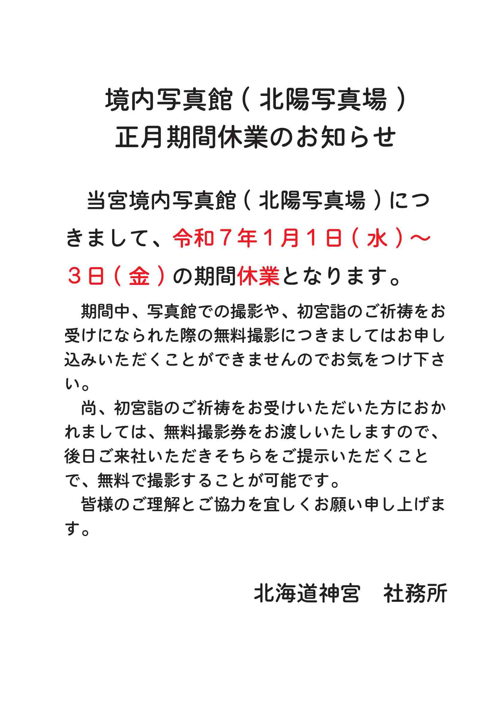 - 令和6年12月06日境内写真館(北陽写真場)正月期間休業のお知らせ