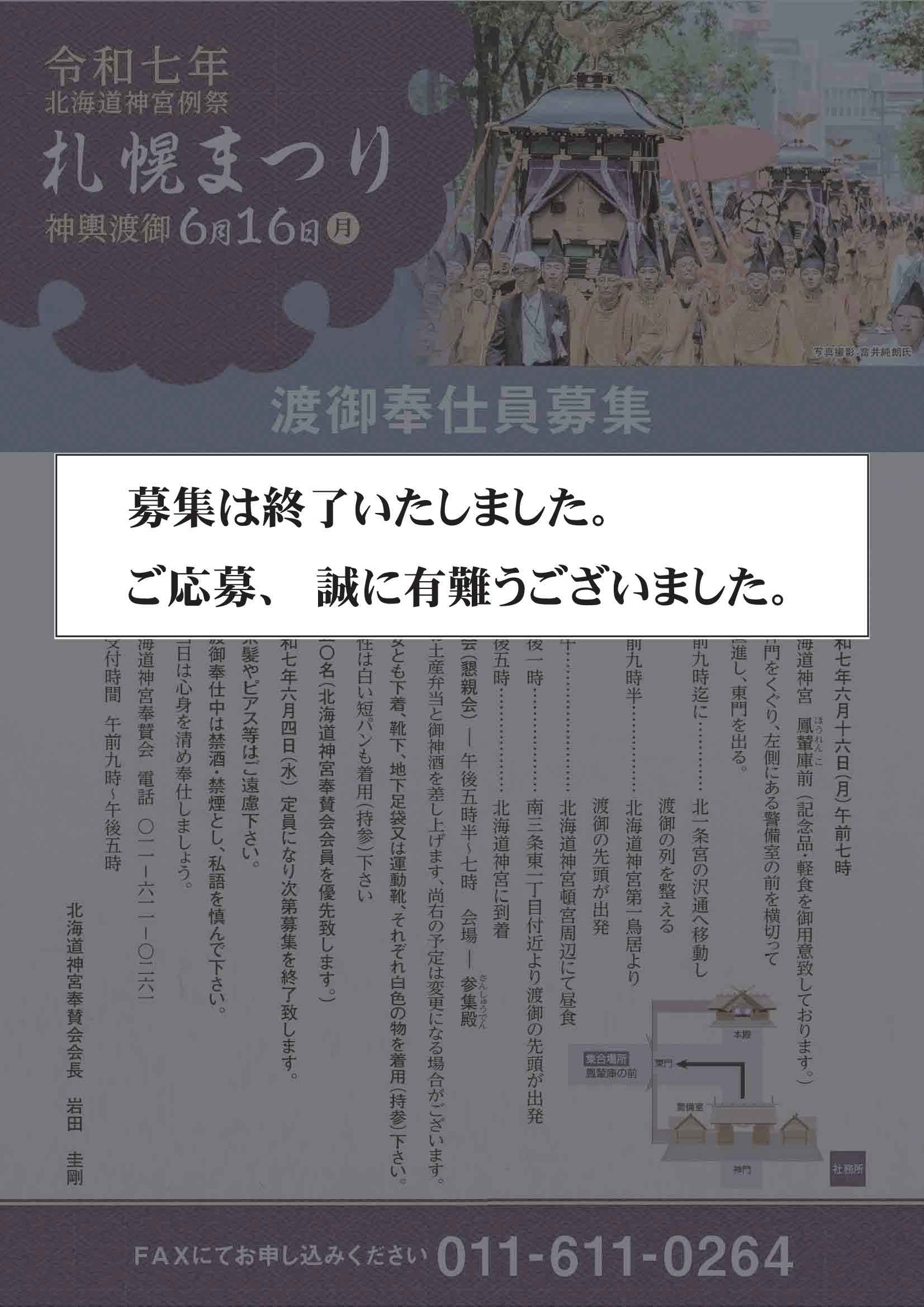 - 令和7年6月9日北海道神宮例祭 神輿渡御奉仕員募集の件【募集終了】
