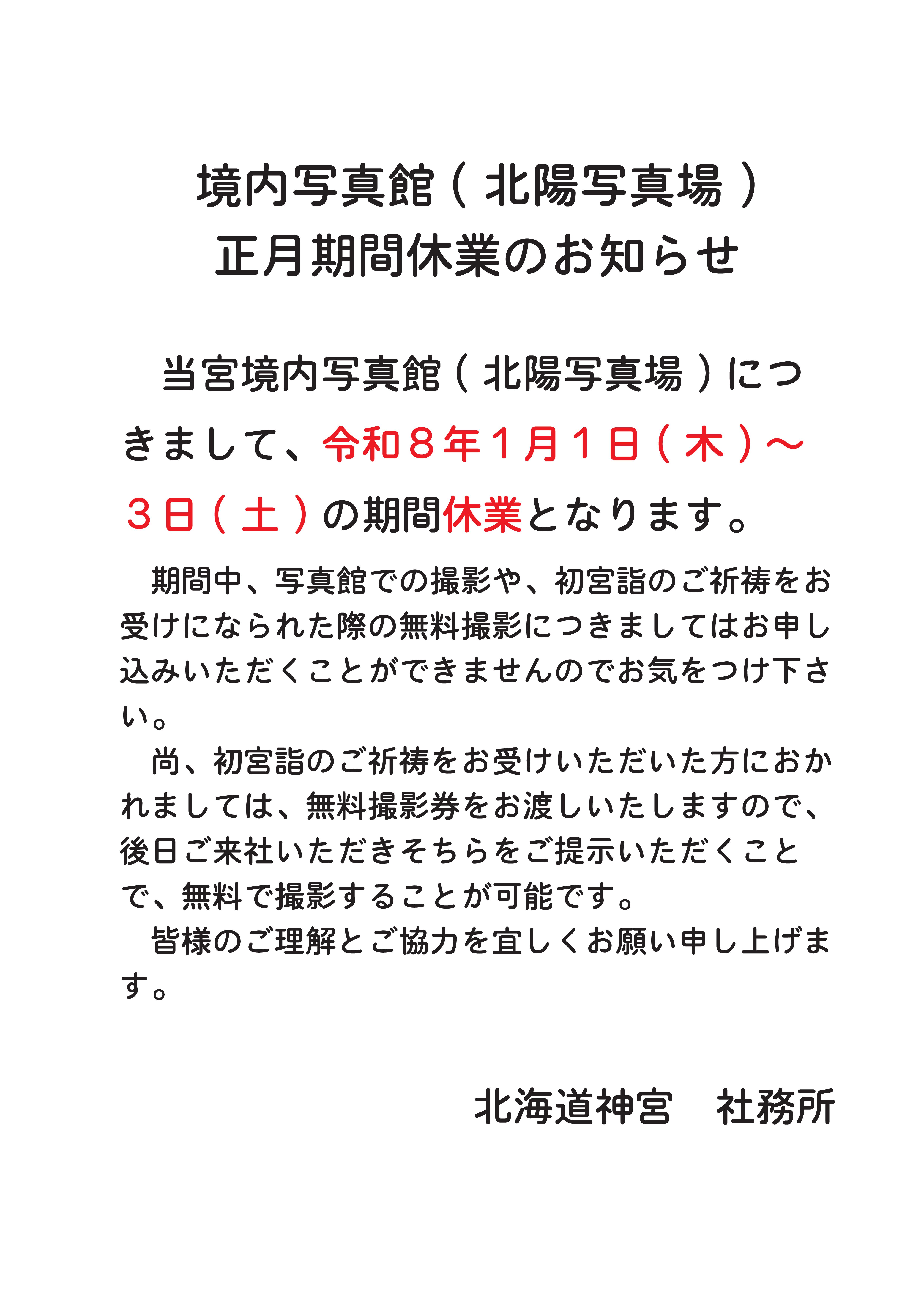 - 令和7年12月15日境内写真館(北陽写真場)正月期間休業のお知らせ