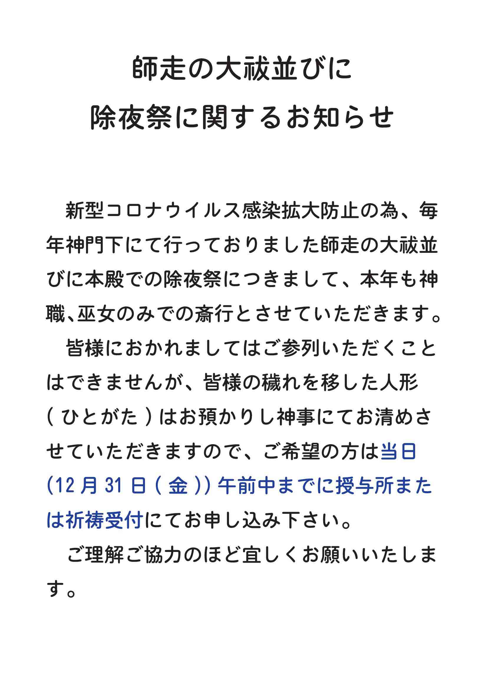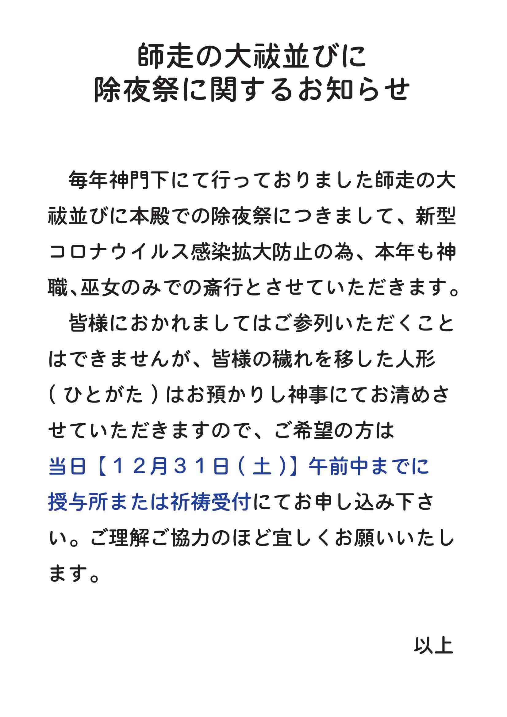 - 令和3年12月25日師走の大祓並びに除夜祭に関するお知らせ