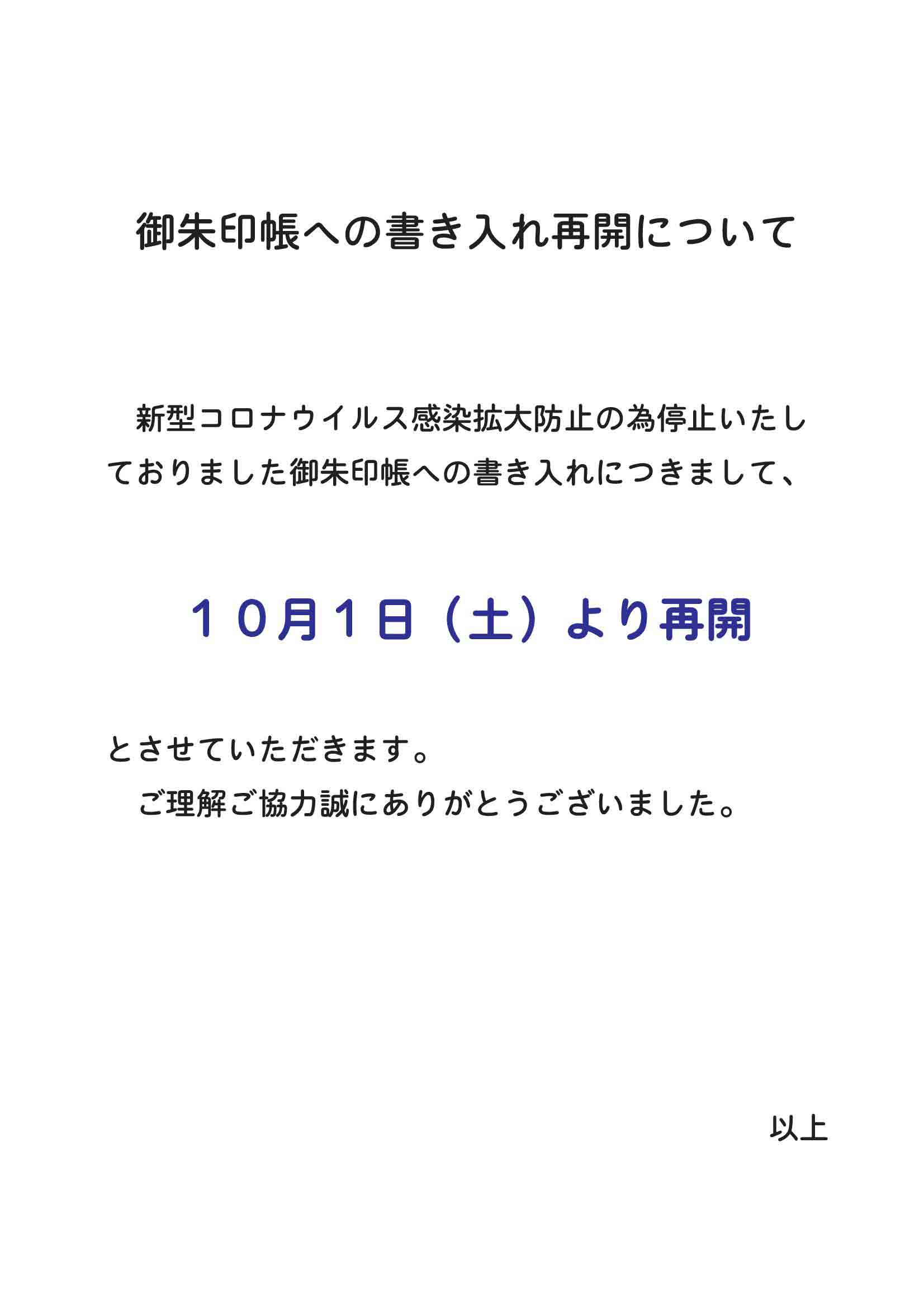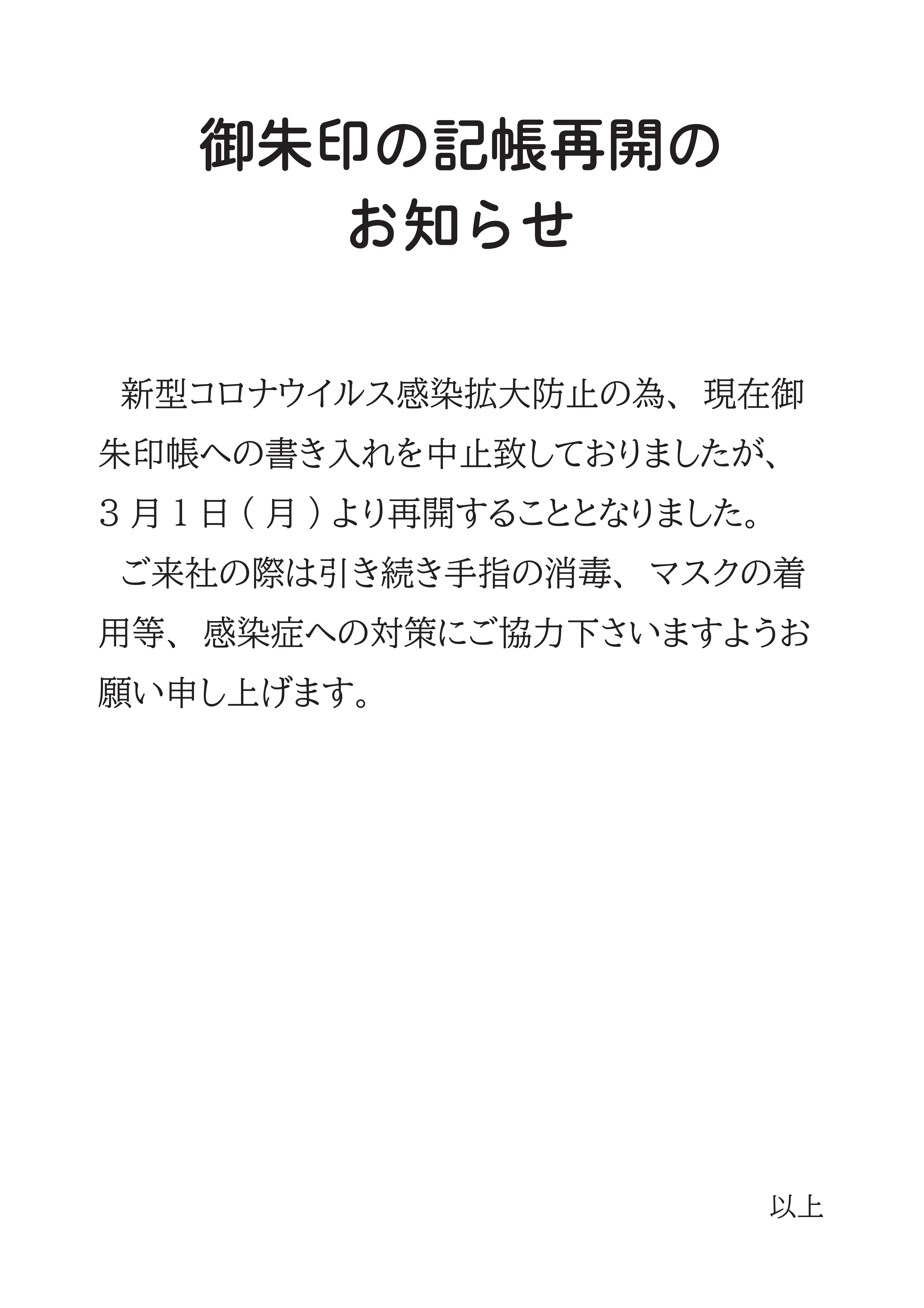 - 令和3年2月24日御朱印の記帳再開のお知らせ