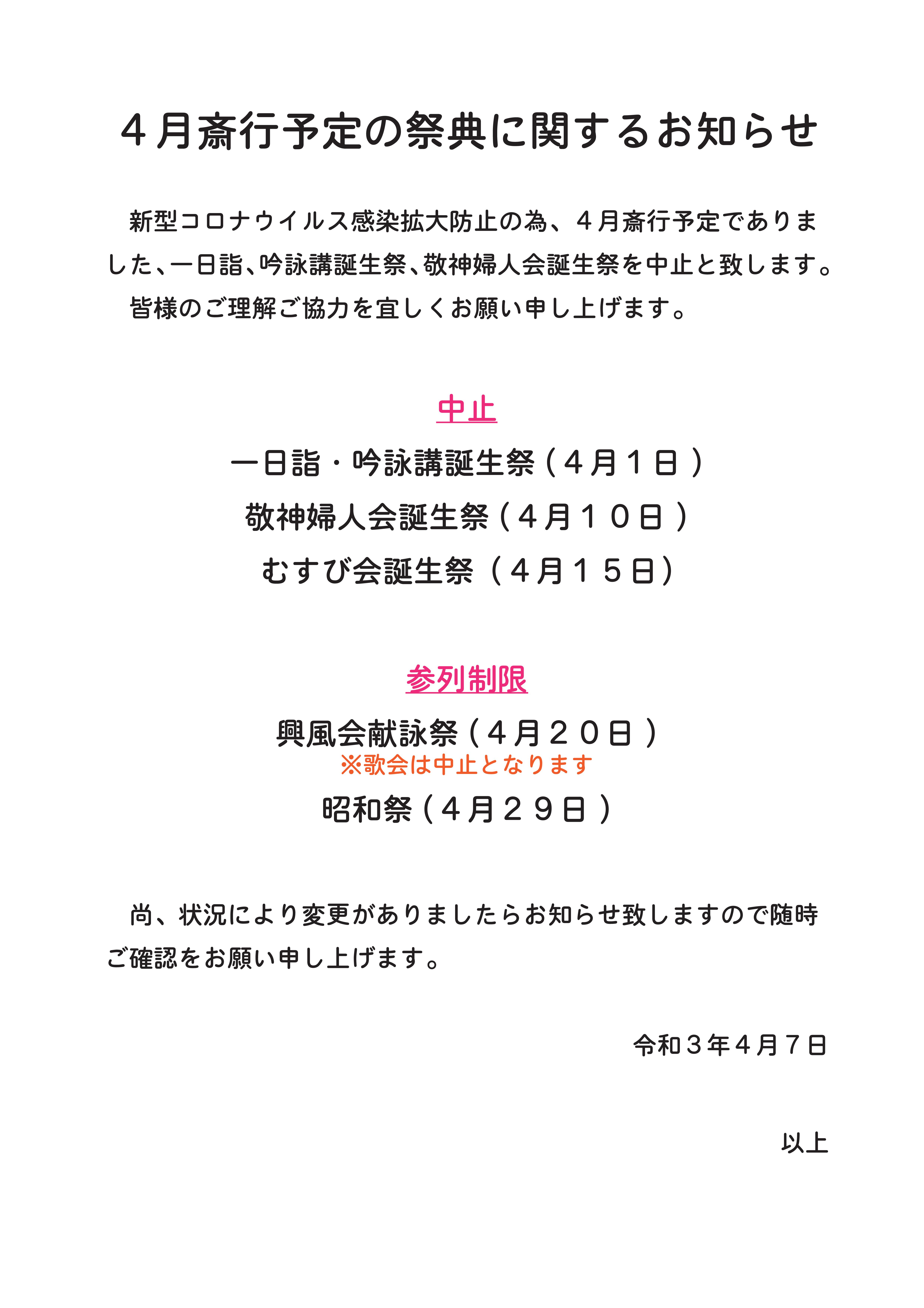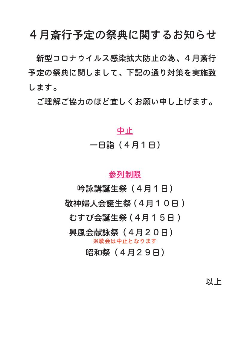 - 令和3年4月7日4月斎行予定の祭典に関するお知らせ【第二報】