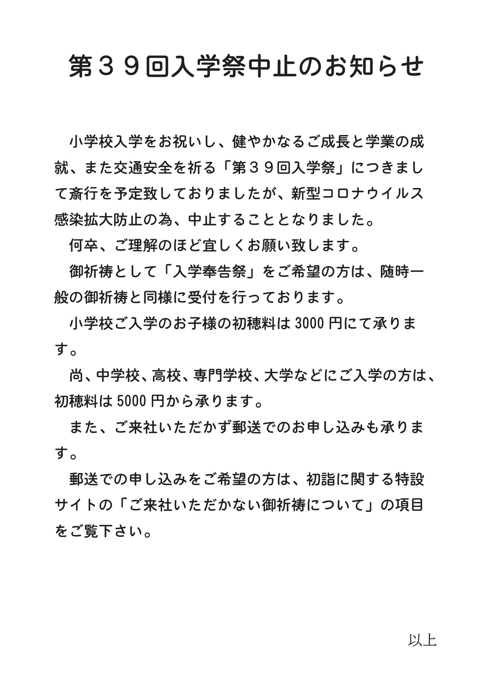 - 令和4年1月27日第39回入学祭中止のお知らせ