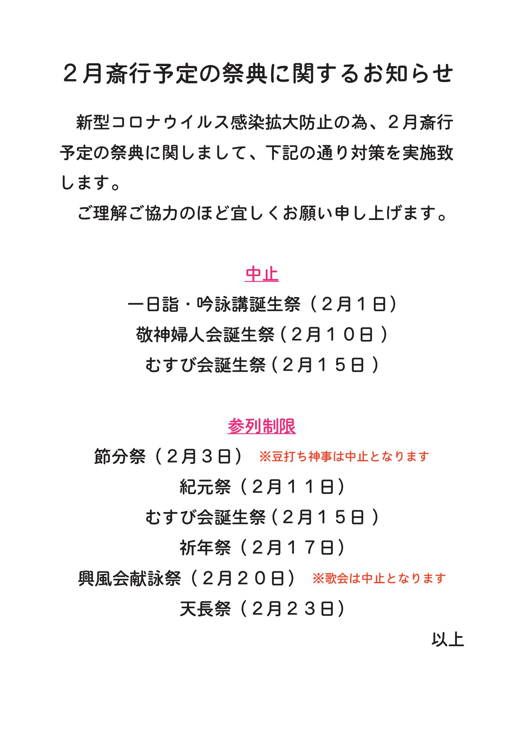 - 令和3年1月18日2月斎行予定の祭典に関するお知らせ