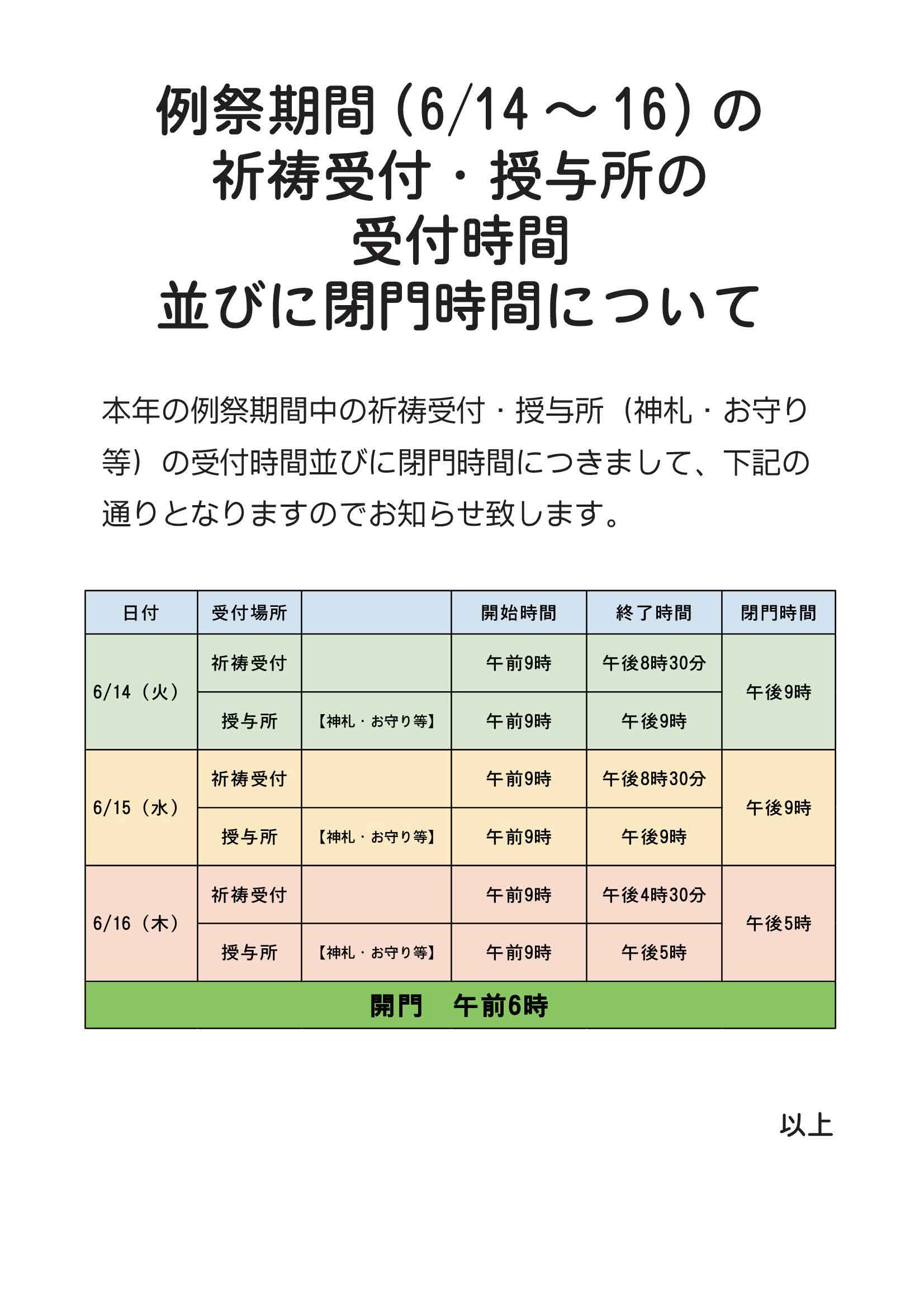 - 令和3年6月8日例祭期間(6/14~16)の祈祷受付・授与所の受付時間について