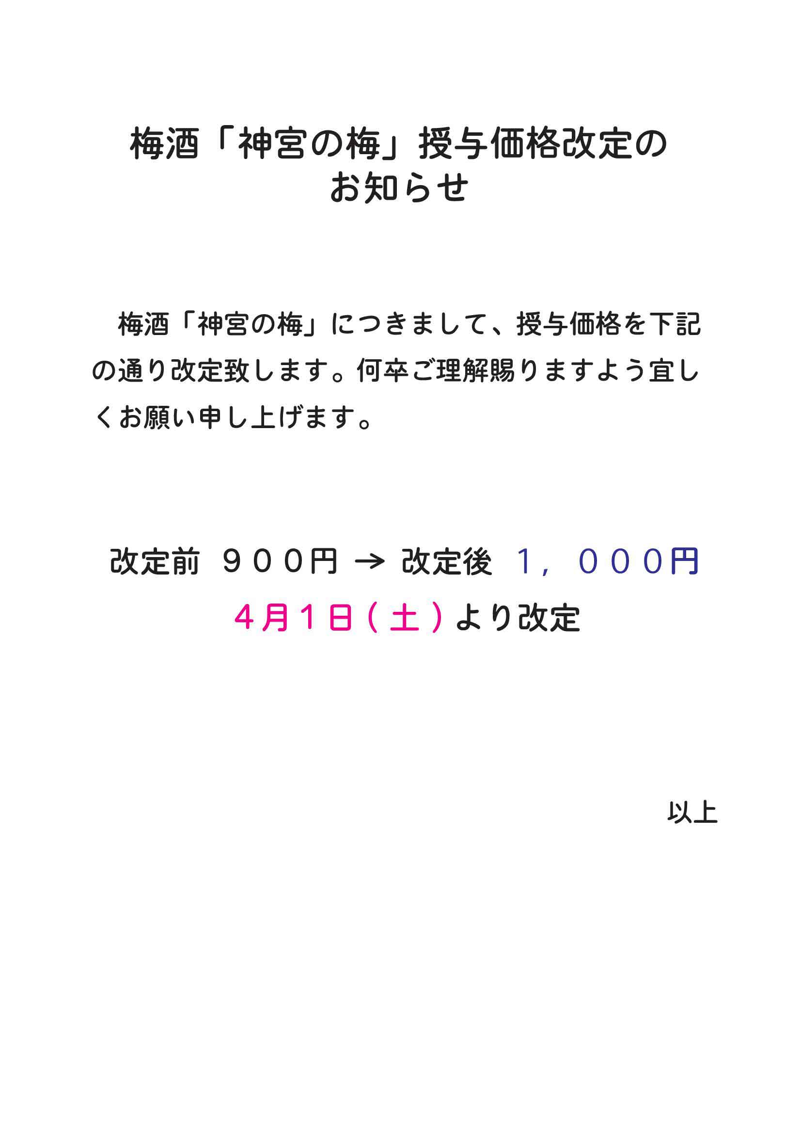 - 令和5年2月13日梅酒「神宮の梅」授与価格改定のお知らせ(4月1日より)
